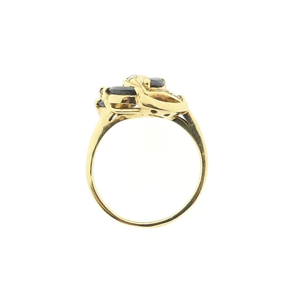 Gold ring set with an oval facet-cut sapphire and stunning round brilliant-cut diamonds. A beautiful mix of gemstones on a floral design. The ring has an elegant and luxurious appearance and is crafted from 14-karat yellow gold (585/1000).