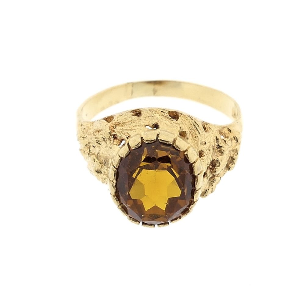 Gold ring set with a large synthetic orange sapphire. The stone is set in a raised setting, making it stand out beautifully, and the frame is elegantly detailed. This beautiful women's ring has a luxurious appearance and is crafted from 18-karat yellow gold (750/1000).