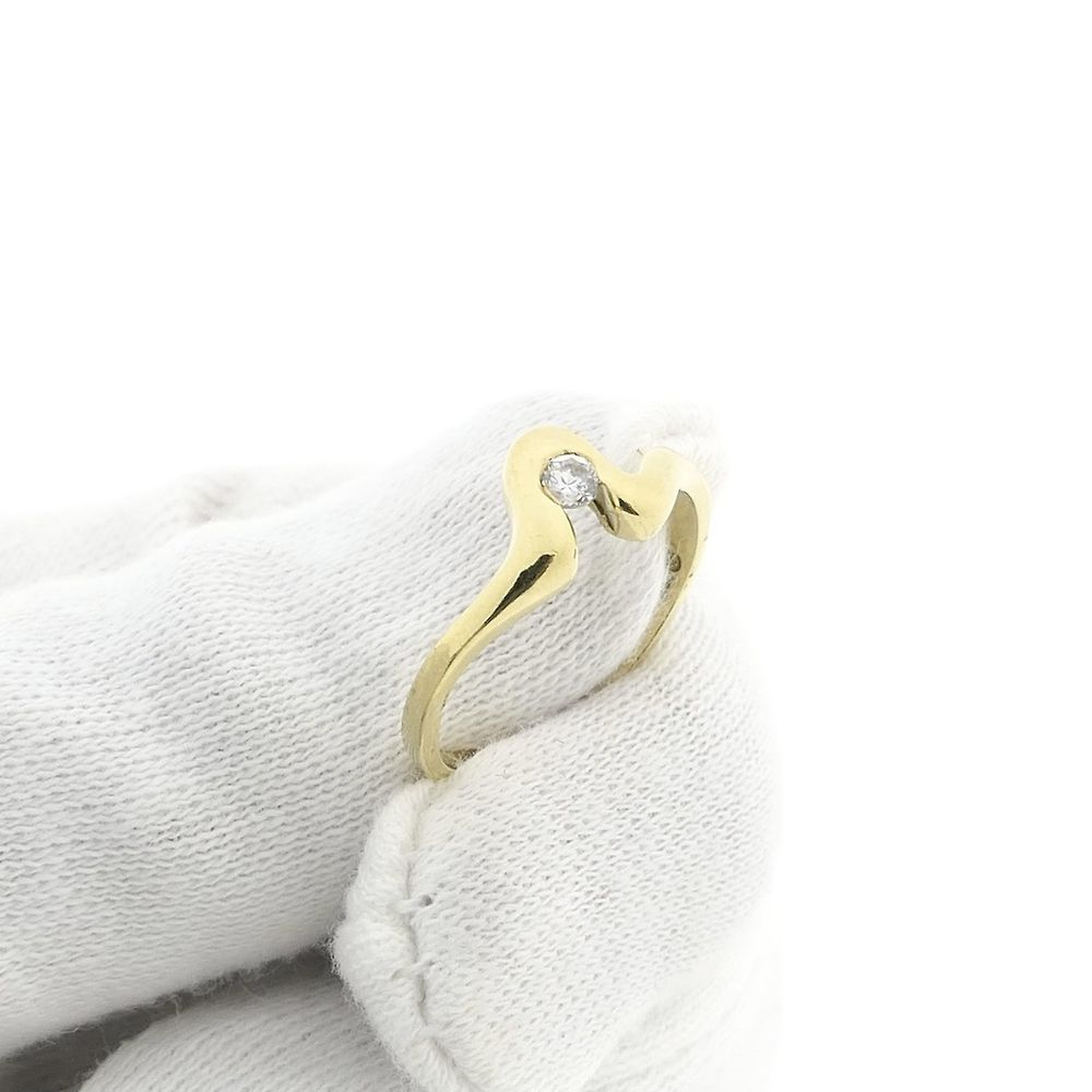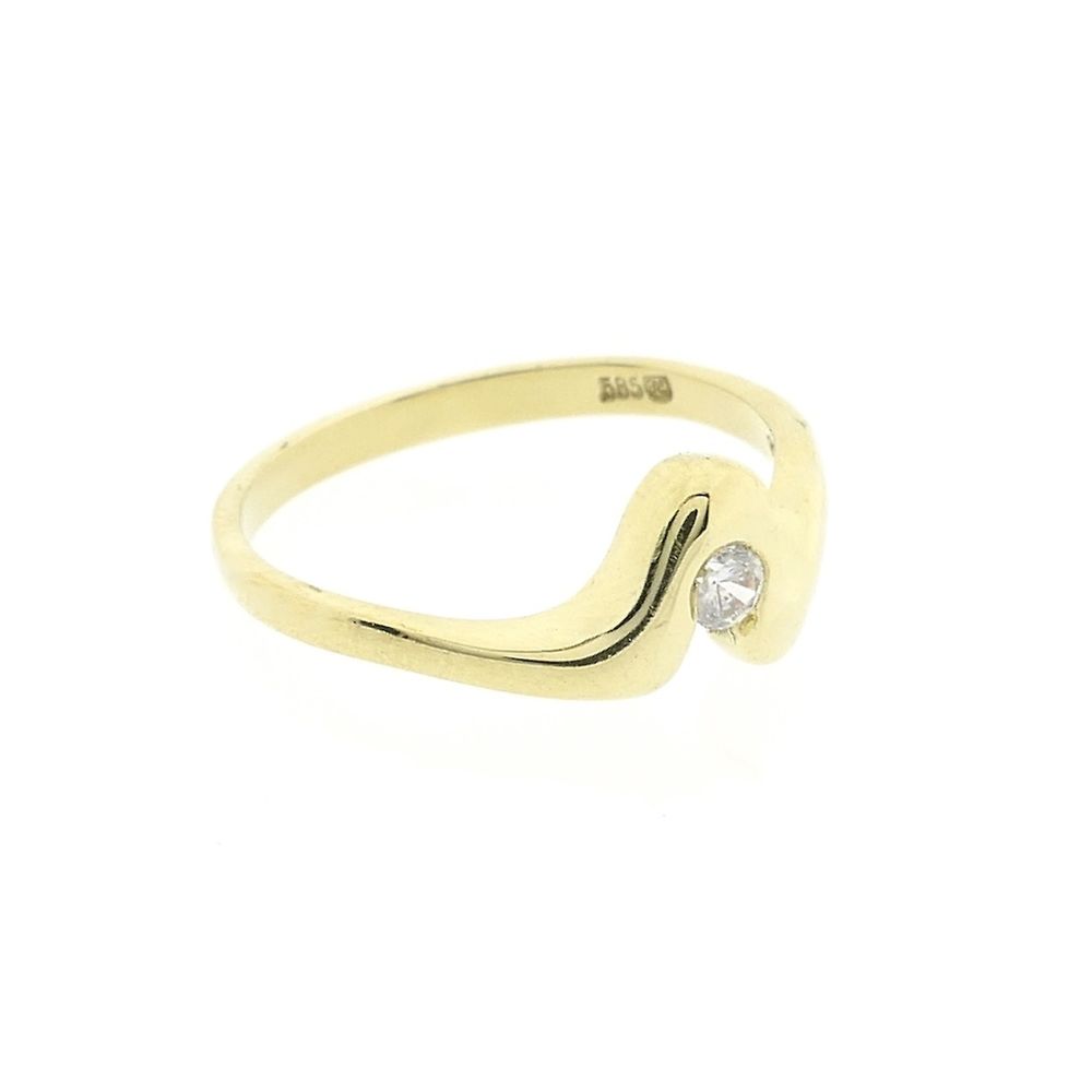 Gold ring set with a round, brilliant-cut zirconia stone. The ring has a domed design and a polished finish. Crafted from 14-karat yellow gold (585/1000), it has a striking appearance.