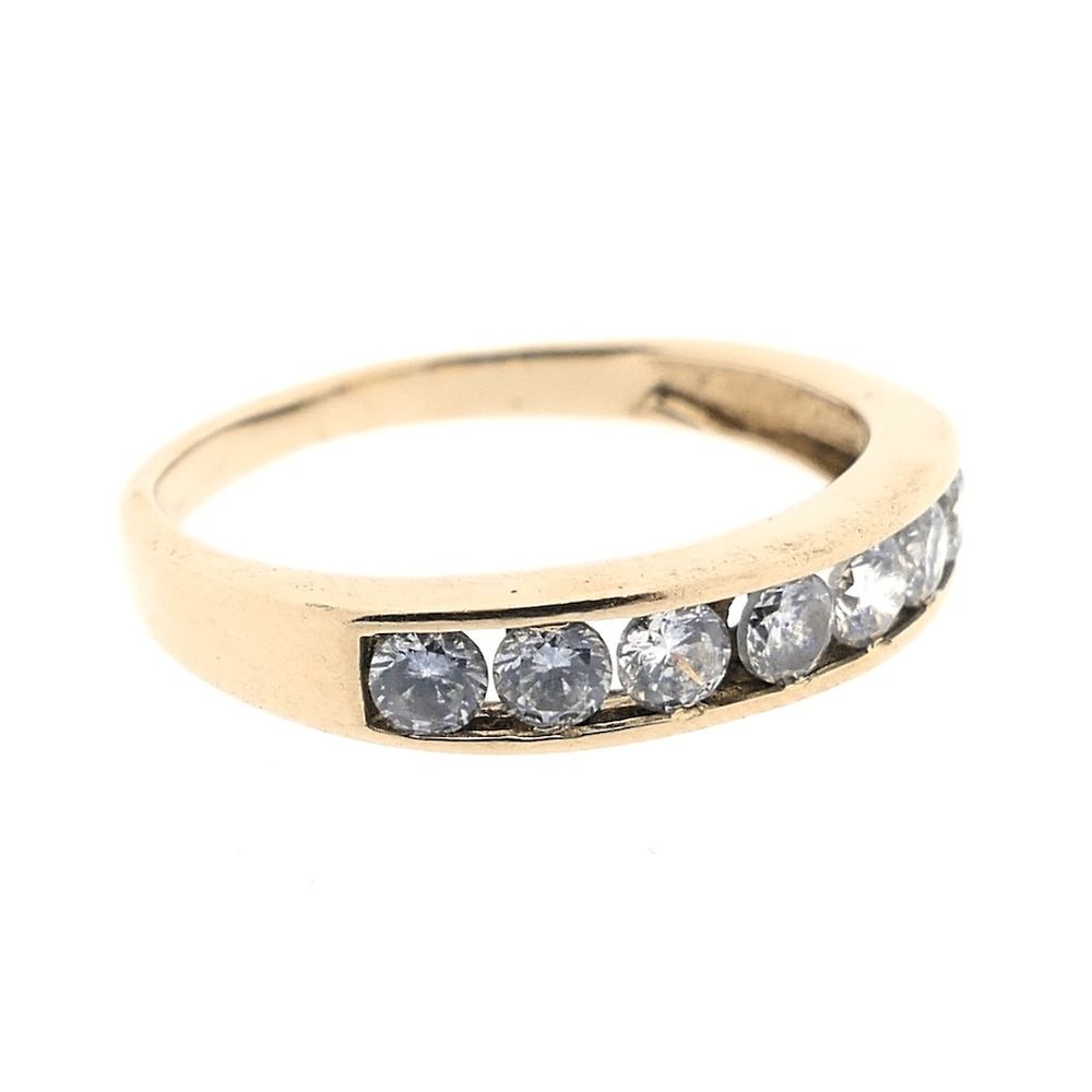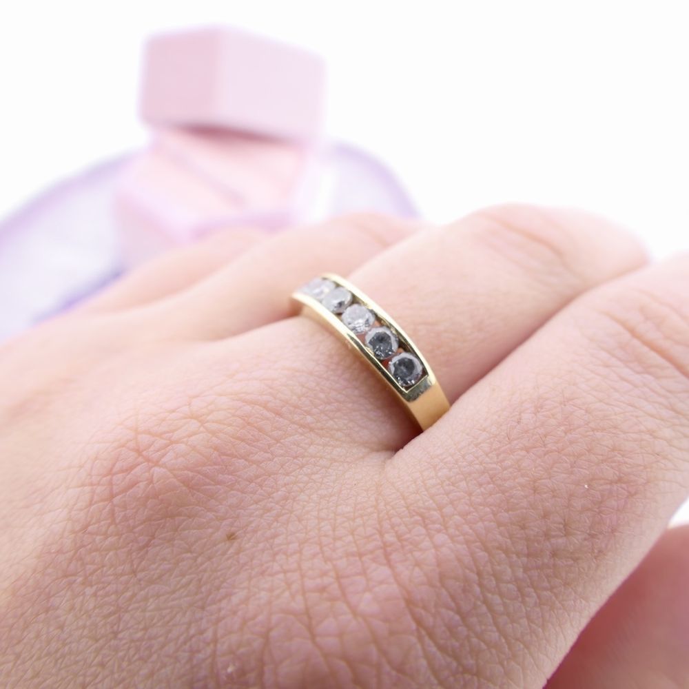 Gold ring with seven round brilliant-cut zirconia stones. The ring is suitable for wearing solo or combined with other rings. This elegant women's ring is crafted from 14-karat yellow gold (585/1000).