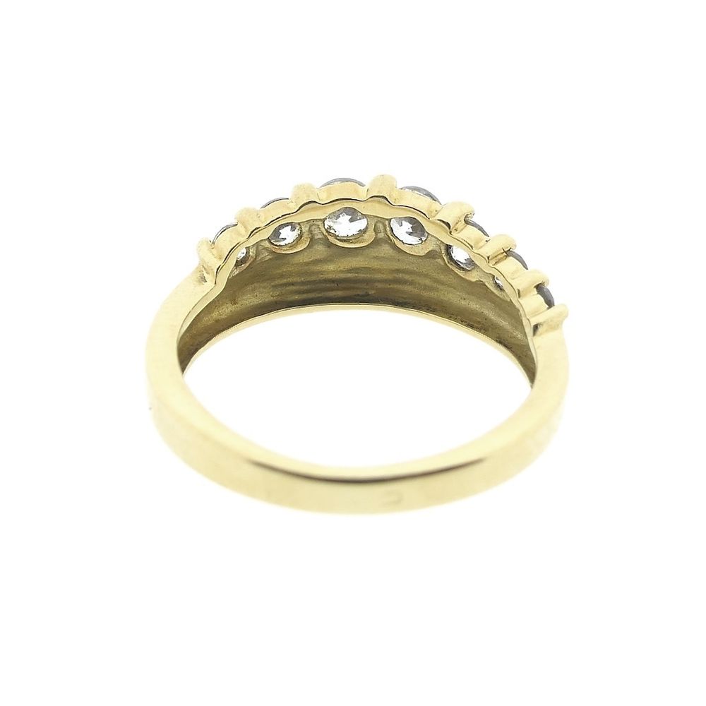 Gold ring with seven round brilliant-cut zirconia stones. The ring is suitable for wearing solo or combined with other rings. It has a crown shape. This elegant women's ring is crafted from 14-karat yellow gold (585/1000).