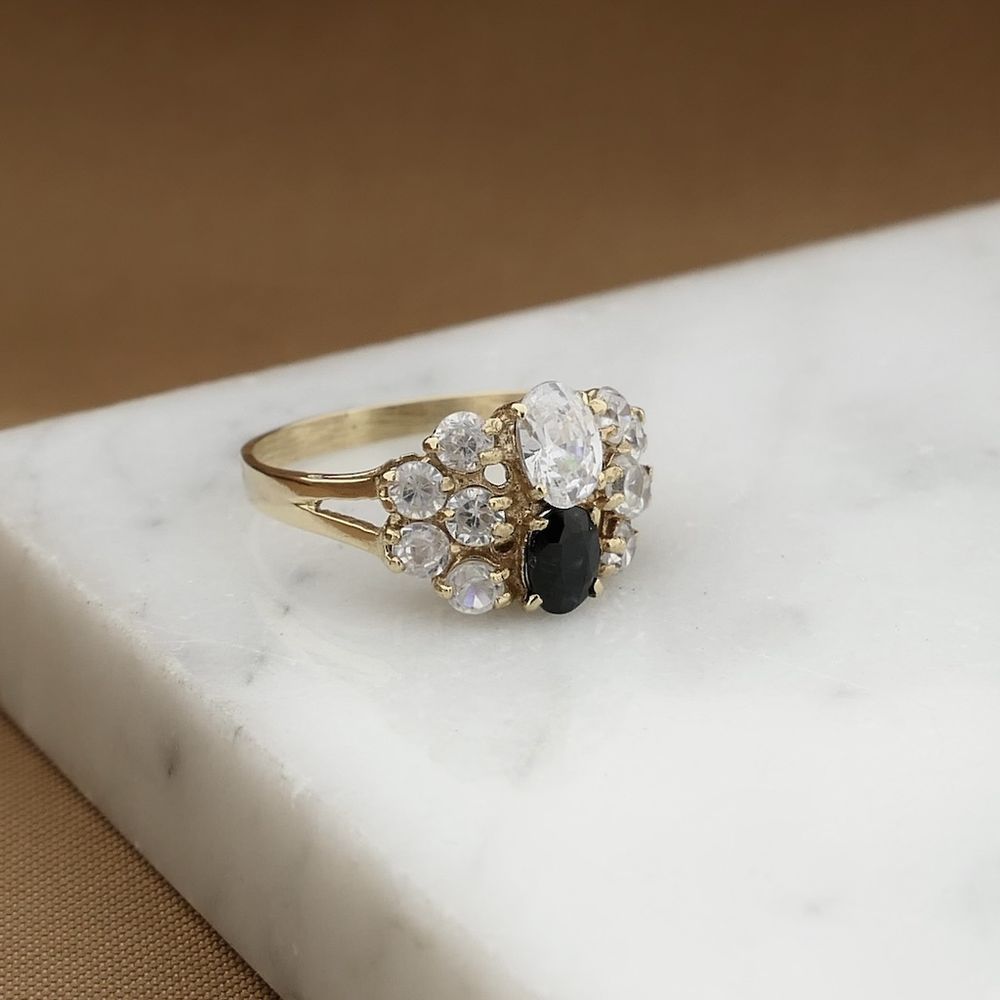 Gold ring set with clear and black zirconia. The ring has an elegant appearance and is crafted from 14-karat yellow gold (585/1000).