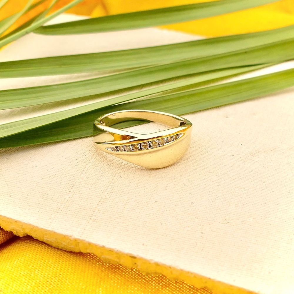 Gold ring set with a row of brilliant-cut zirconia stones. The ring has an elegant design and is polished to a shine. The piece is made of 14-karat yellow gold (585/1000).