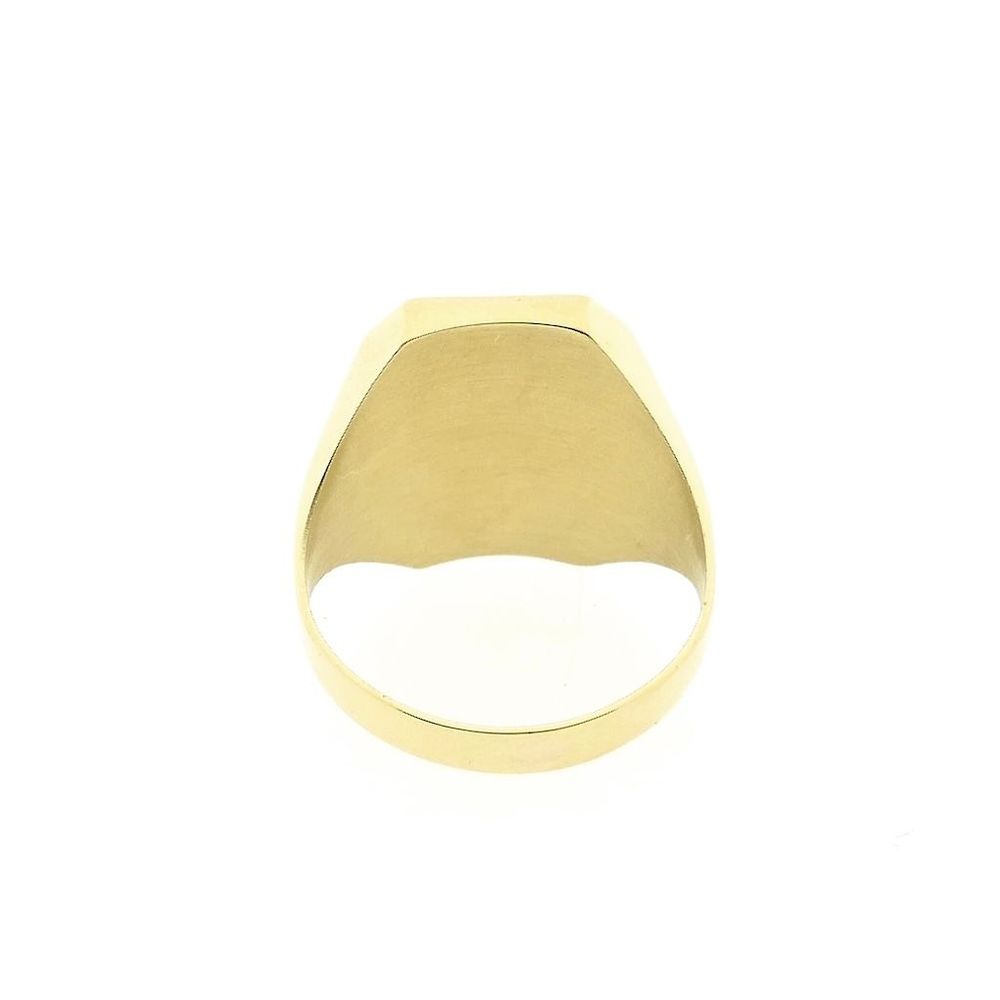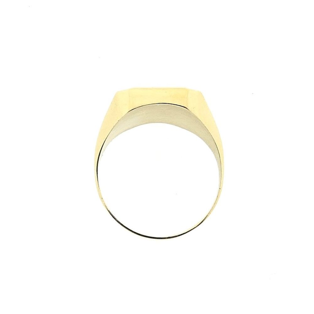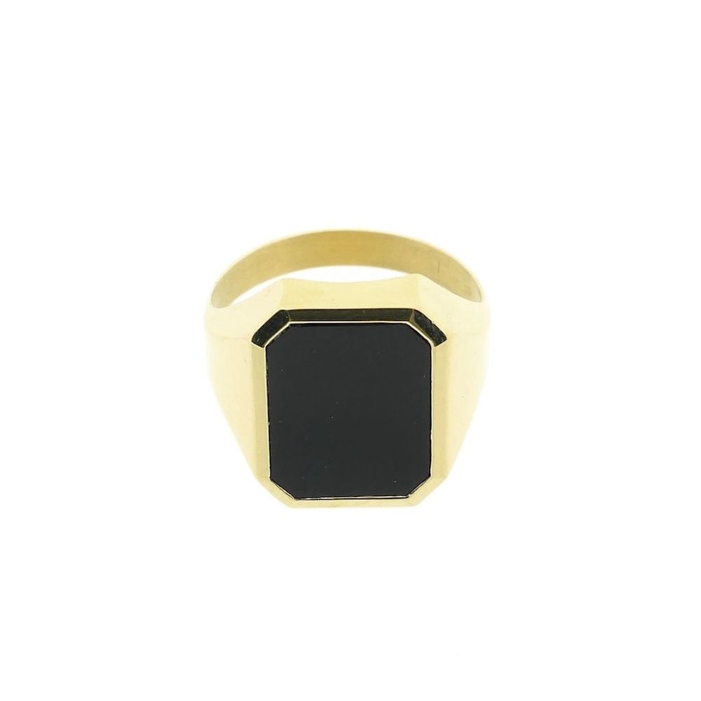 Gold signet ring set with an onyx. The jet-black stone is cut into a rectangle with cut-out corners. The ring is crafted from 14-karat yellow gold (585/1000).