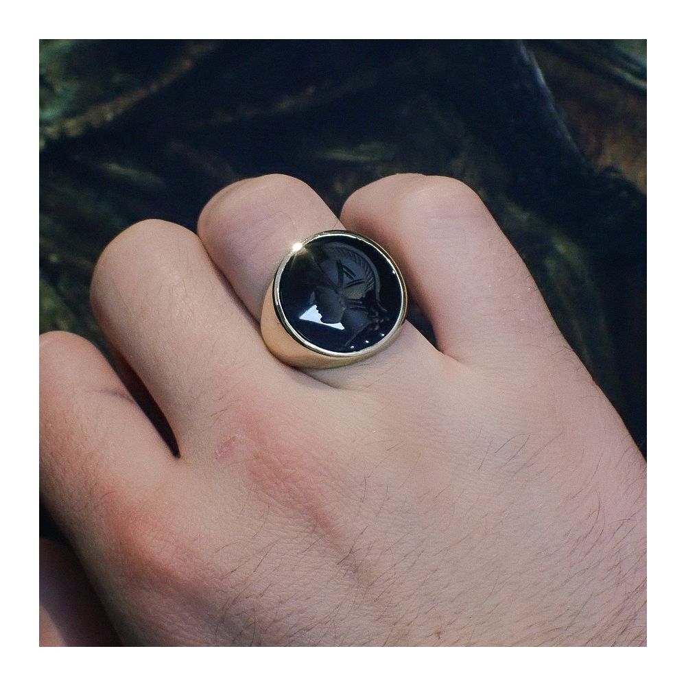 Gold signet ring with onyx stone | engraved with a Roman soldier