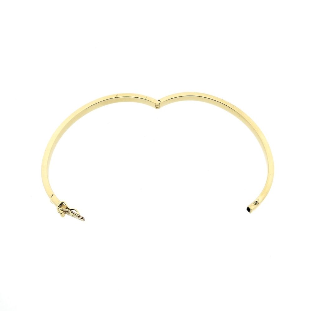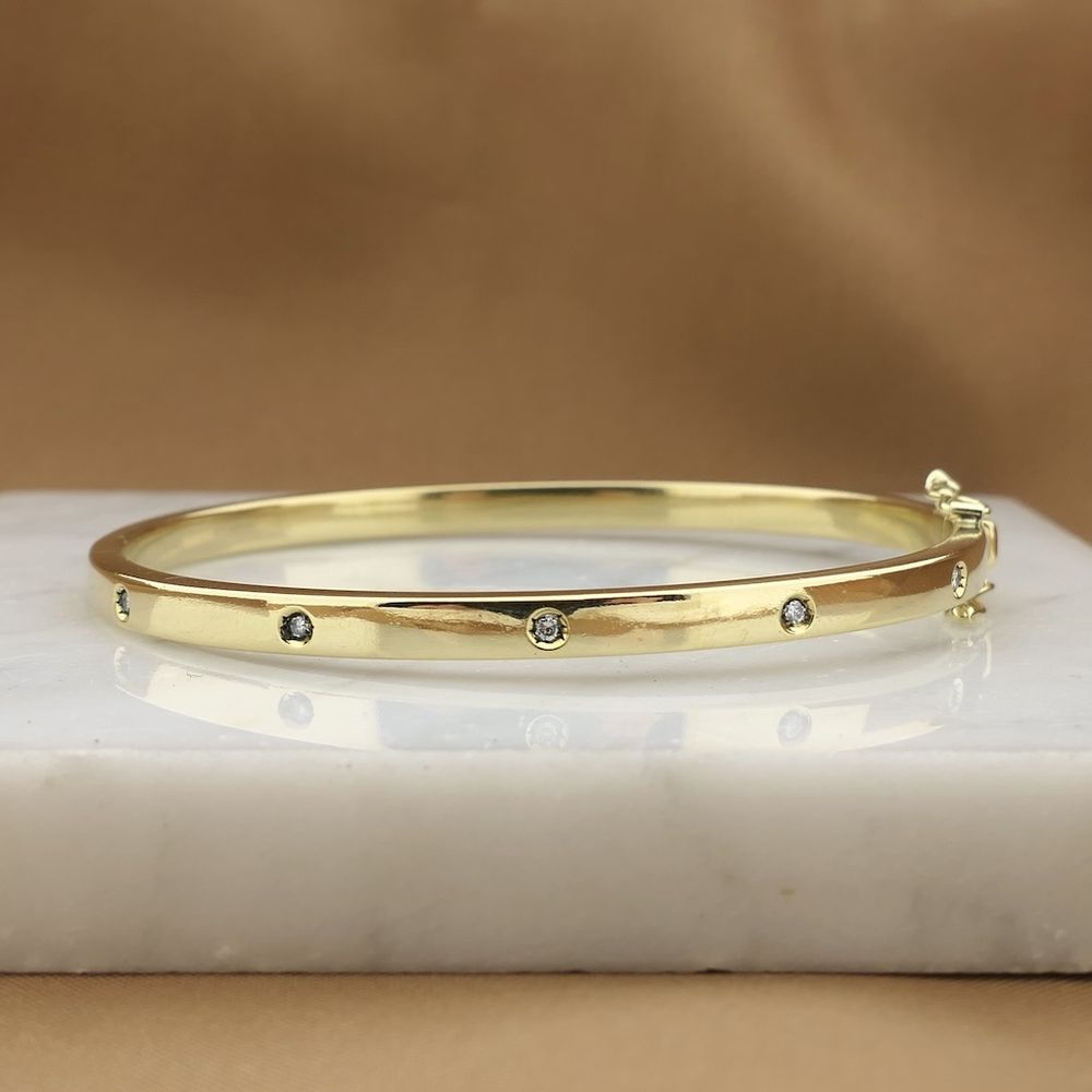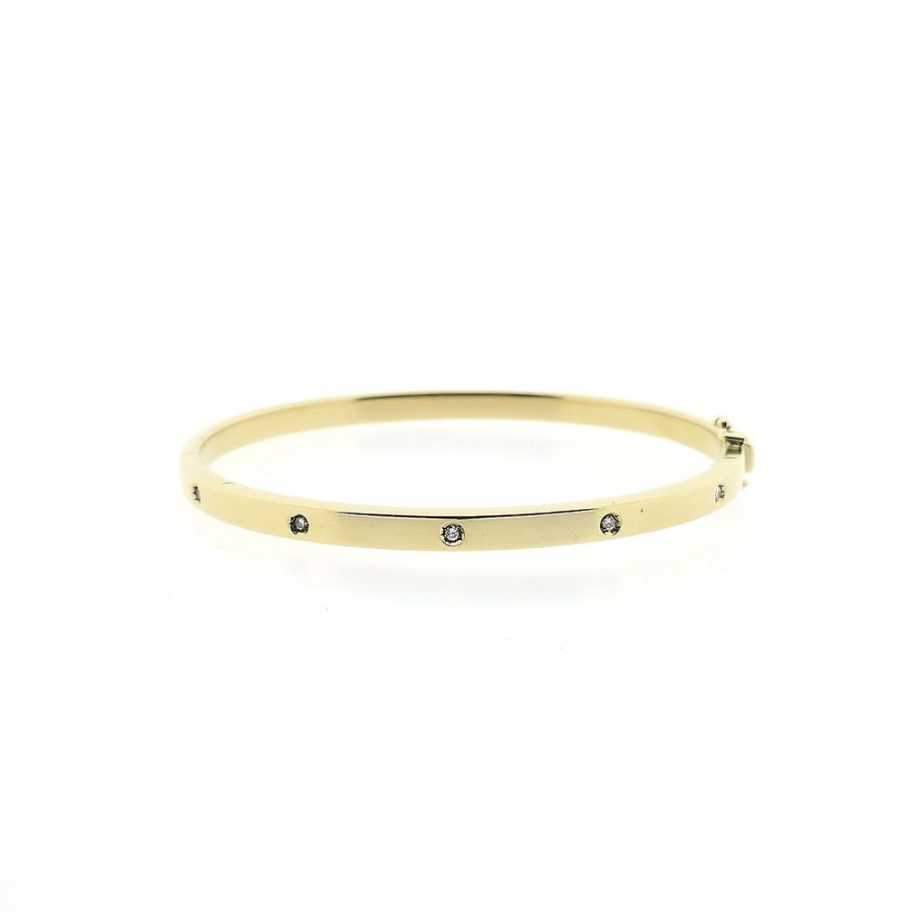 Gold bangle set with natural diamonds. Suitable for wearing solo or layered with other jewelry, this subtle and elegant piece is perfect for the wrist. The bracelet closes with a box clasp and safety hooks and is crafted from 18-karat yellow gold (750/1000).