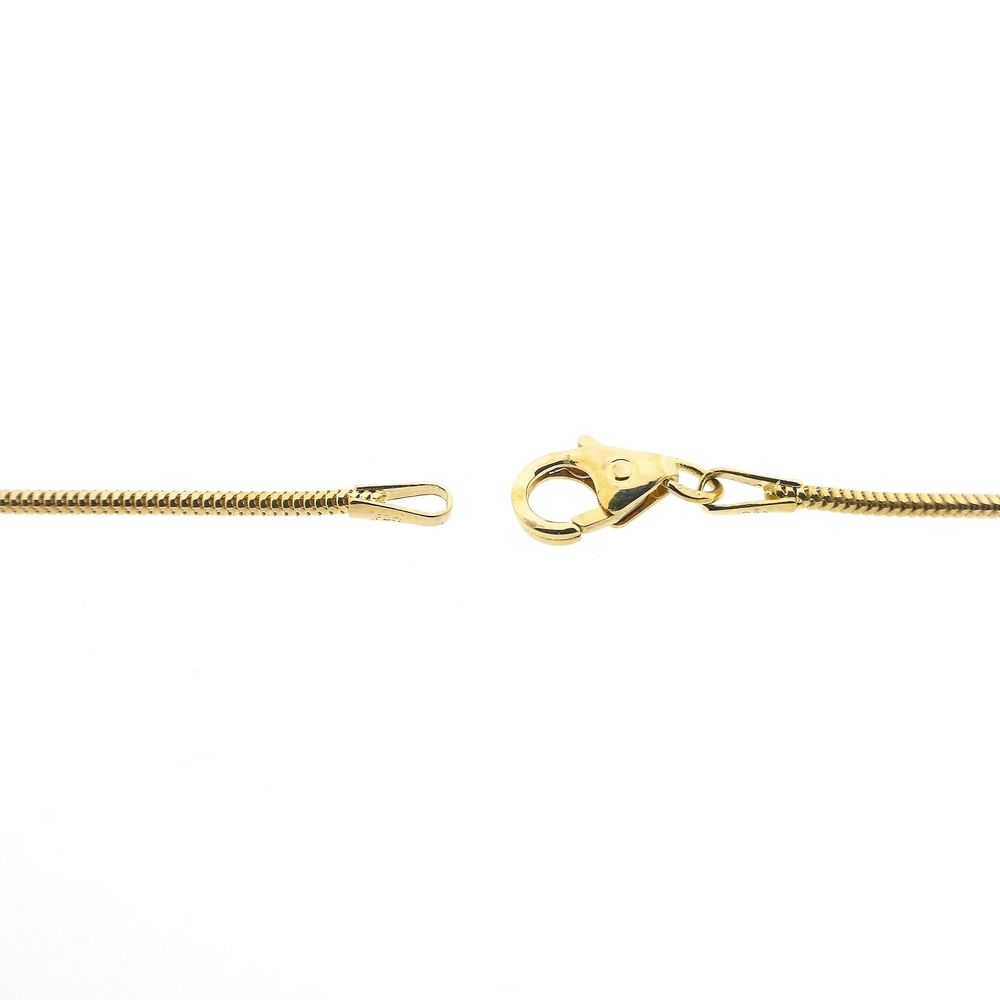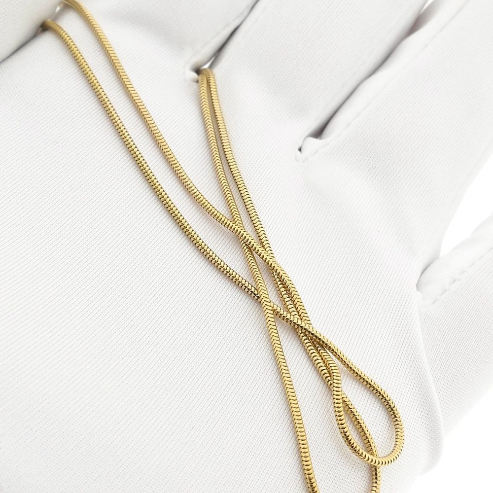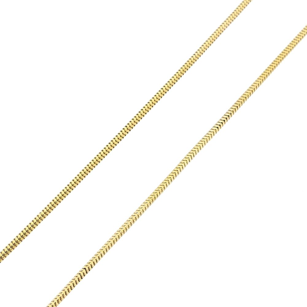 Gold snake-link necklace. The necklace features shiny links that fit together beautifully. The cord is supple and smooth, making it a modern women's jewelry piece. The necklace is crafted from 14-karat yellow gold (585/1000).