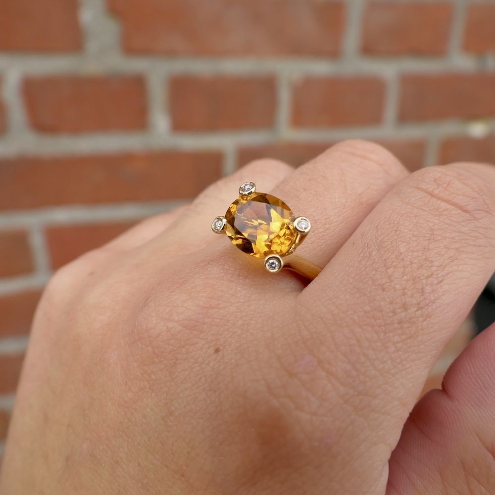 Gold solitaire ring set with a large, striking citrine and four round, brilliant-cut diamonds in a donut setting. The citrine is clear and orange-yellow in color. The stone is oval-faceted and measures 11.1 mm x 9.1 mm. The ring is crafted from 18-karat yellow gold (750/1000).
