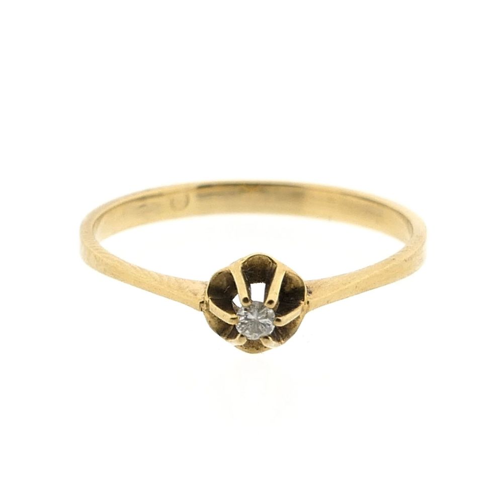 Gold solitaire ring set with a 0.03 ct. diamond. The diamond is set in a high six-pronged chaton. The ring is crafted from 14-karat yellow gold (585/1000).