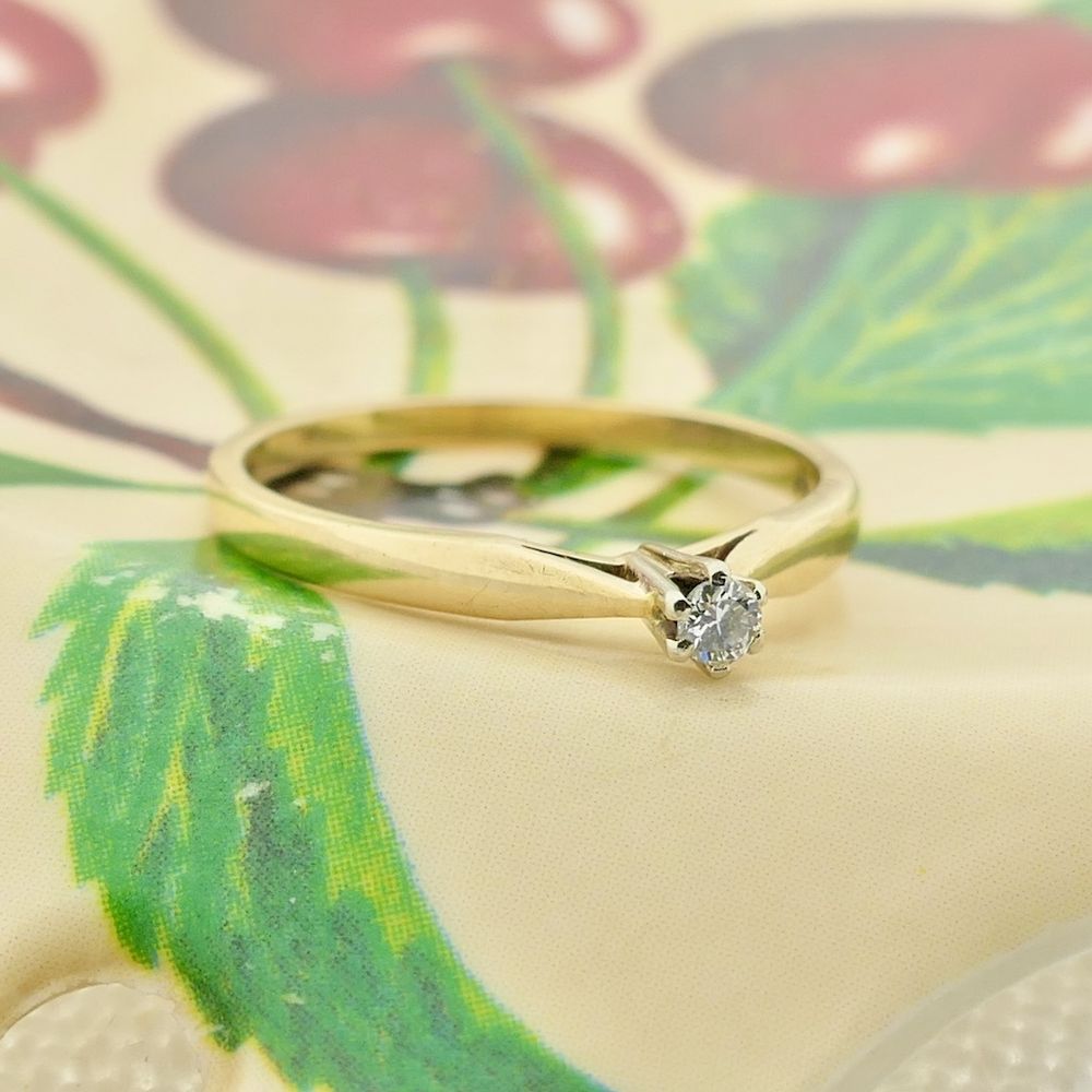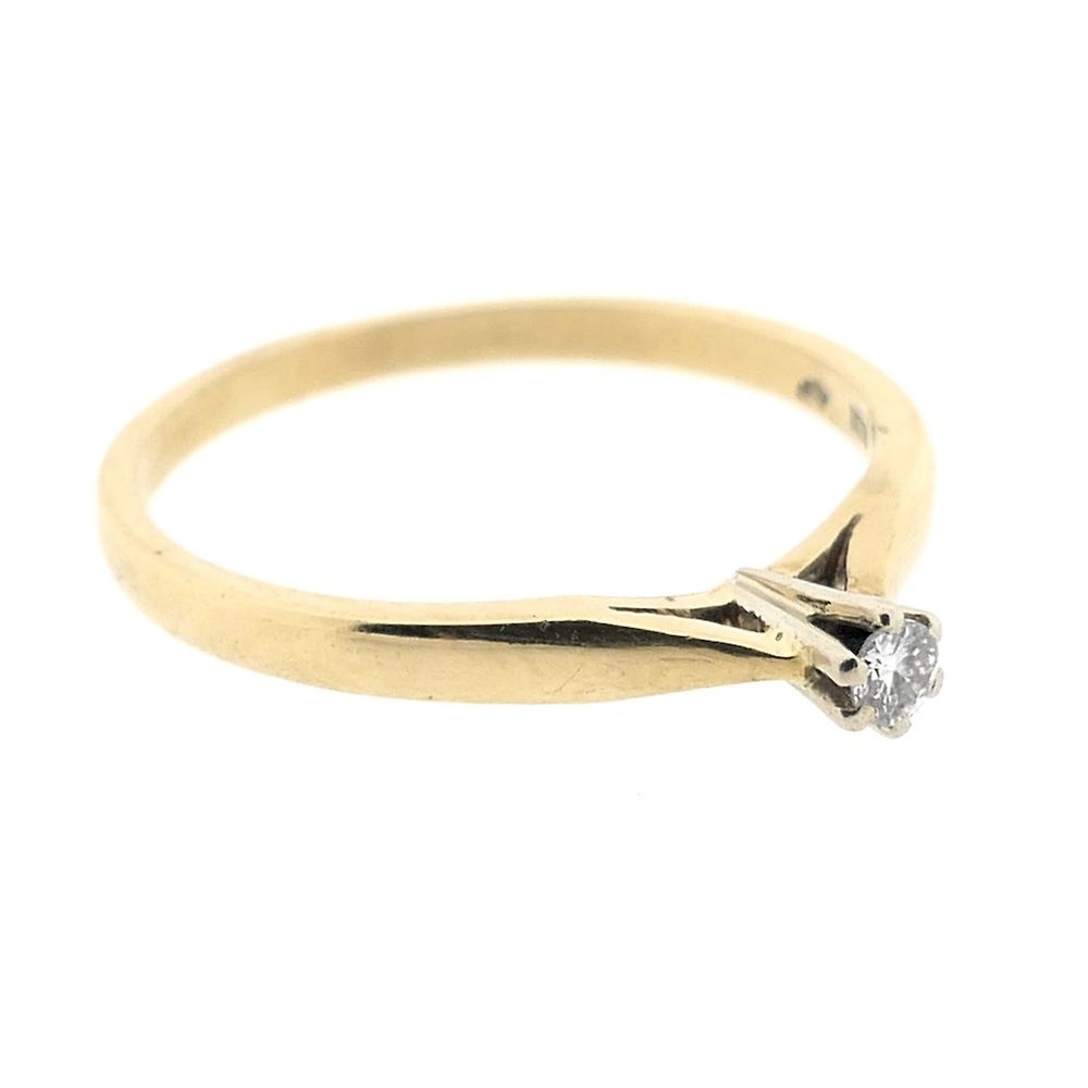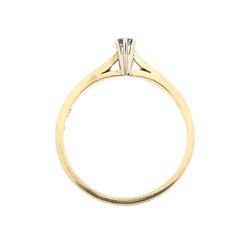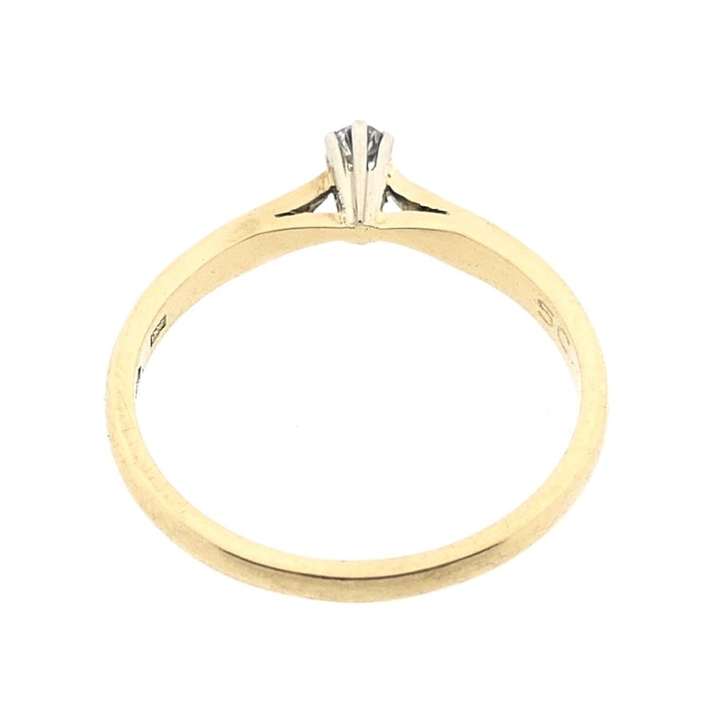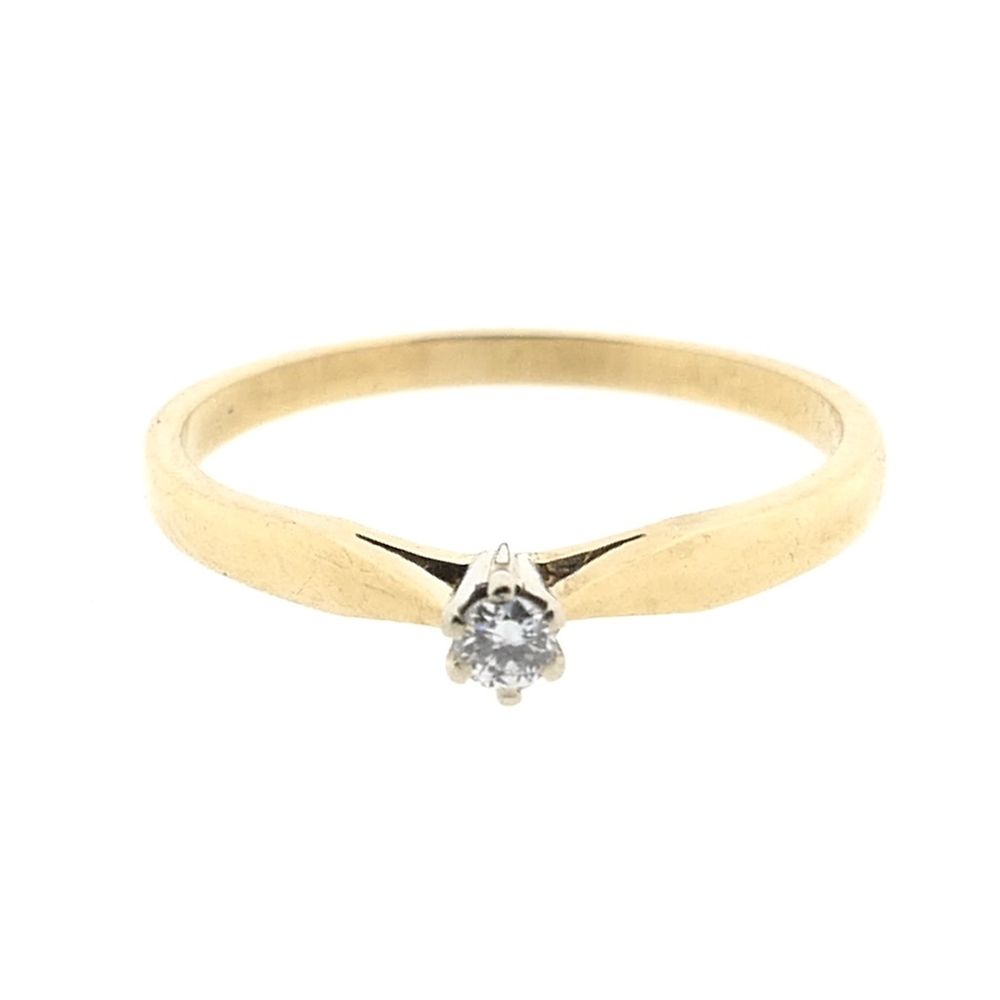 Gold solitaire ring set with a 0.05 ct. natural round brilliant-cut diamond. The stone is set in a high, six-pronged white gold chaton. The piece has a subtle appearance and is crafted from 14-karat yellow gold (585/1000).