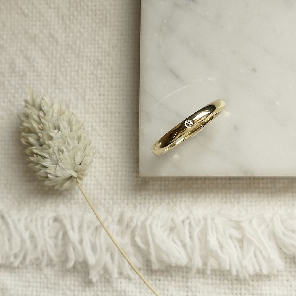 A gold solitaire ring from the luxury brand Tiffany & Co., from the Elsa Peretti collection. The ring has a timeless design and is set with a 0.02-carat diamond. Crafted from 18-karat yellow gold (750/1000), it is a true gemstone.