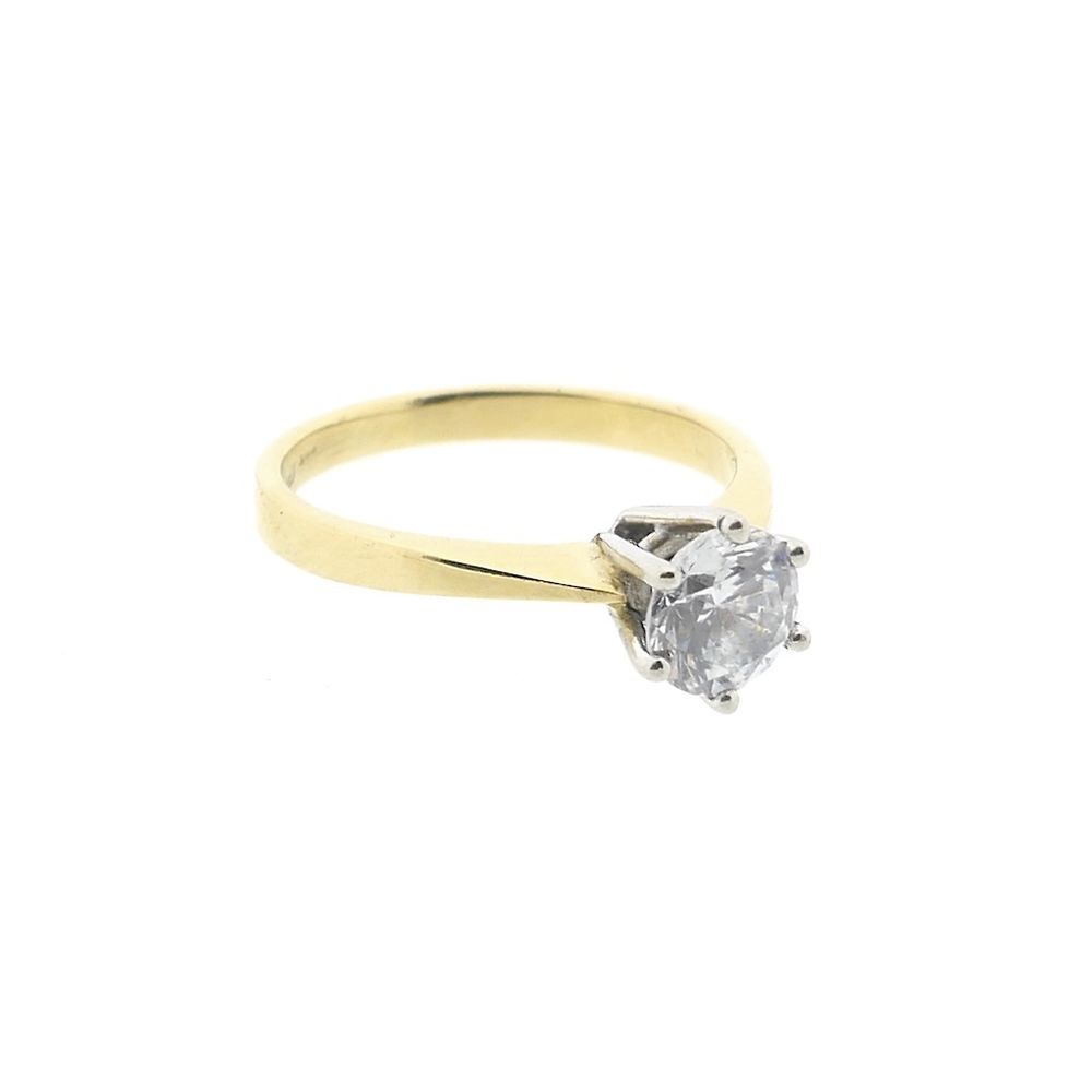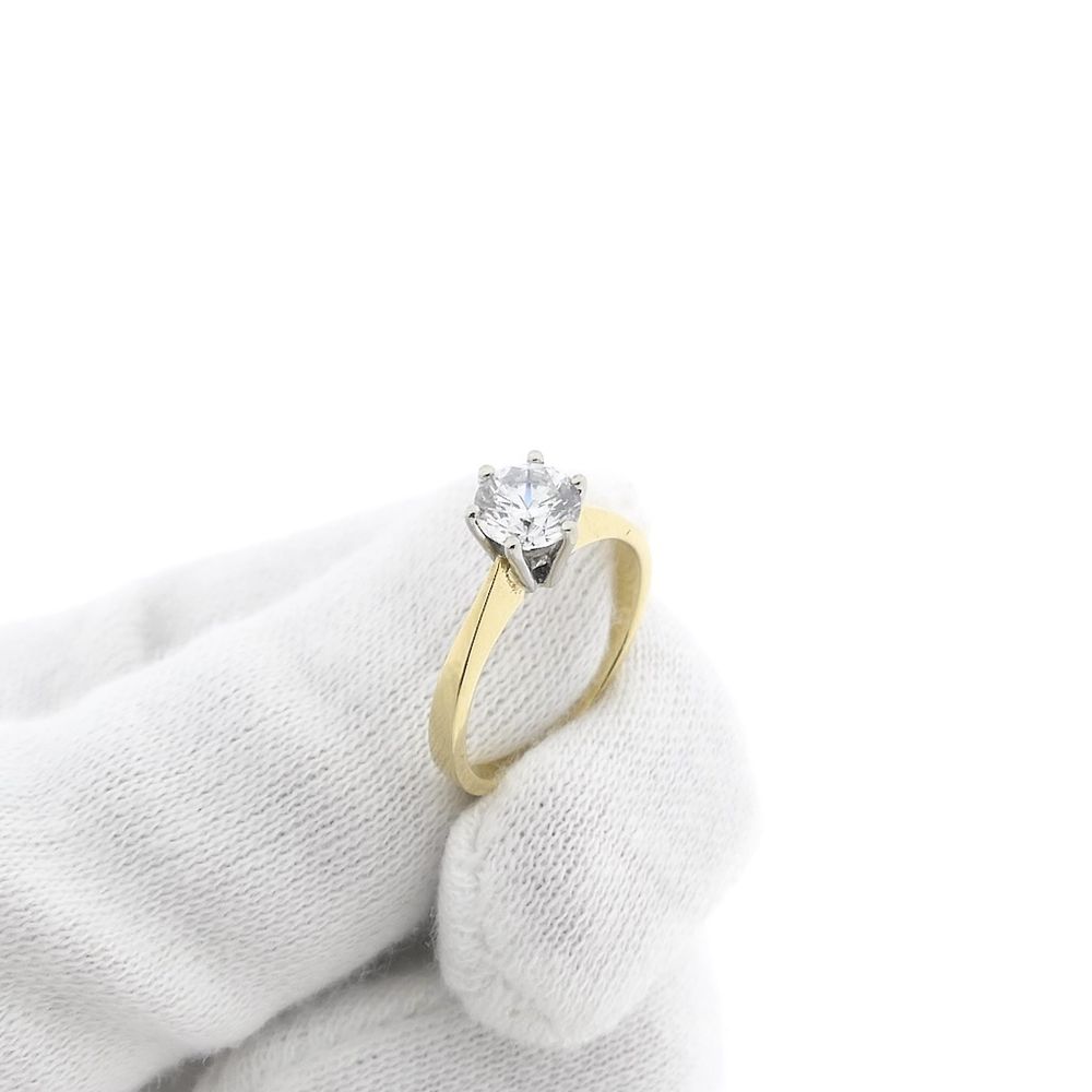 Gold solitaire ring with zirconia. The stone is set in a high, six-pronged white gold chaton. The stone has a diameter of 6.0 mm. The ring has a subtle appearance and is crafted from 14-karat yellow gold (585/1000).