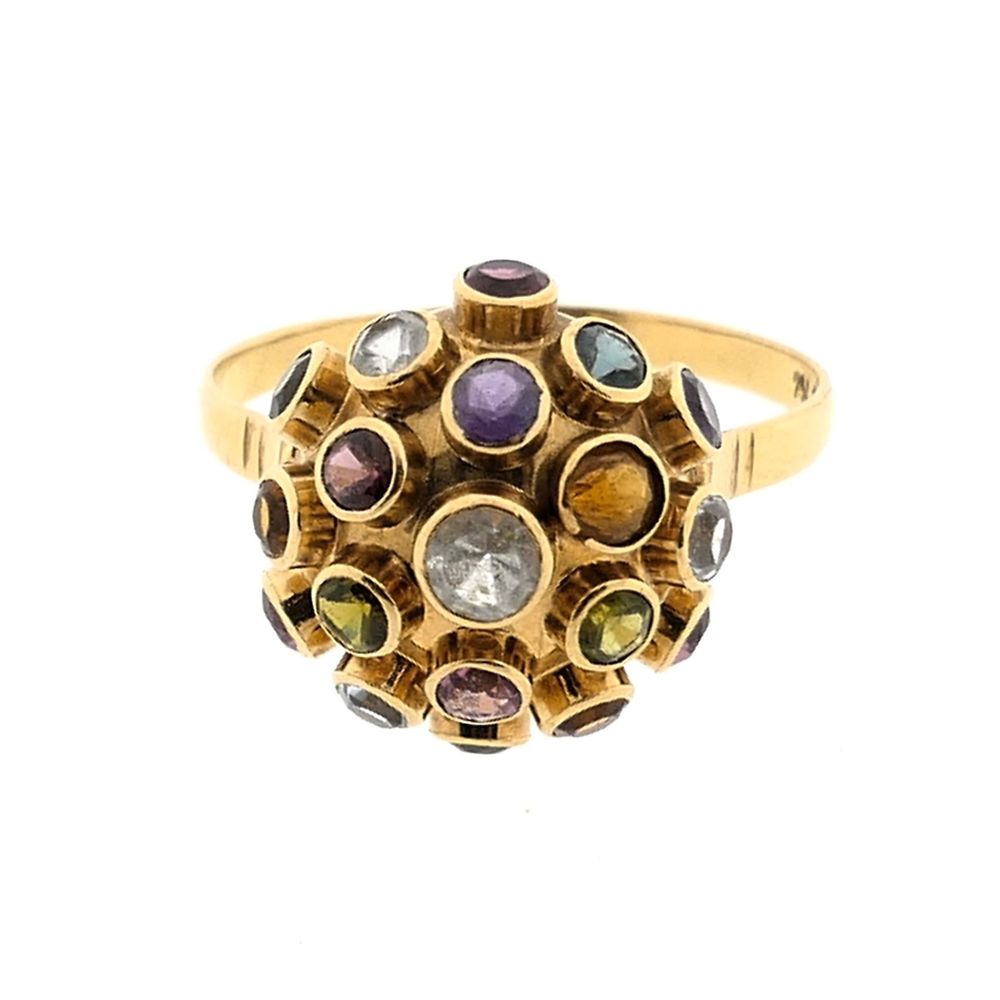 Gold Sputnik ring set with a mix of gemstones. The stones are aquamarine, citrine, amethyst, and peridot; these are brilliant-cut. The ring is crafted from 18-karat yellow gold (750/1000).