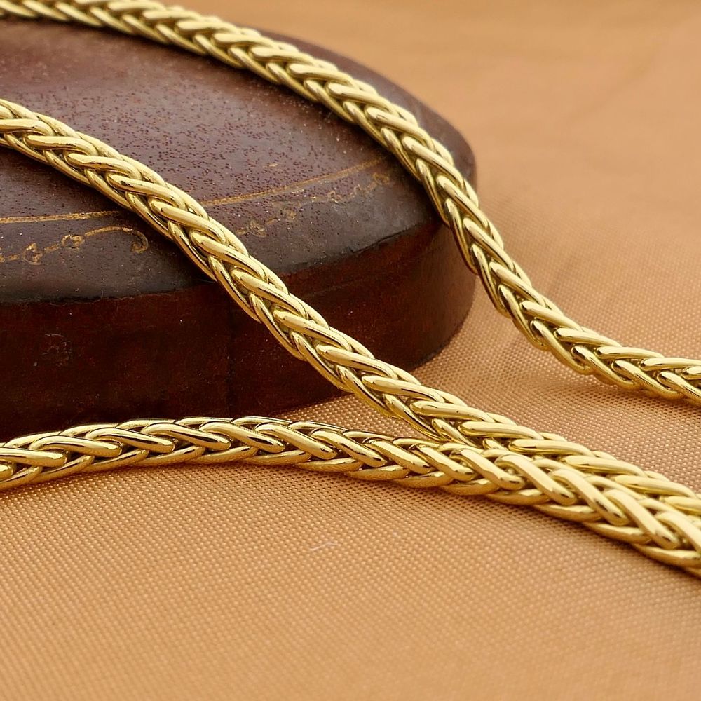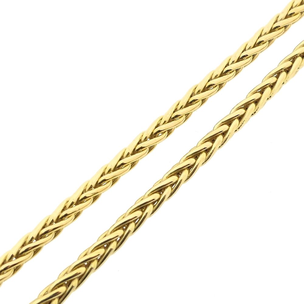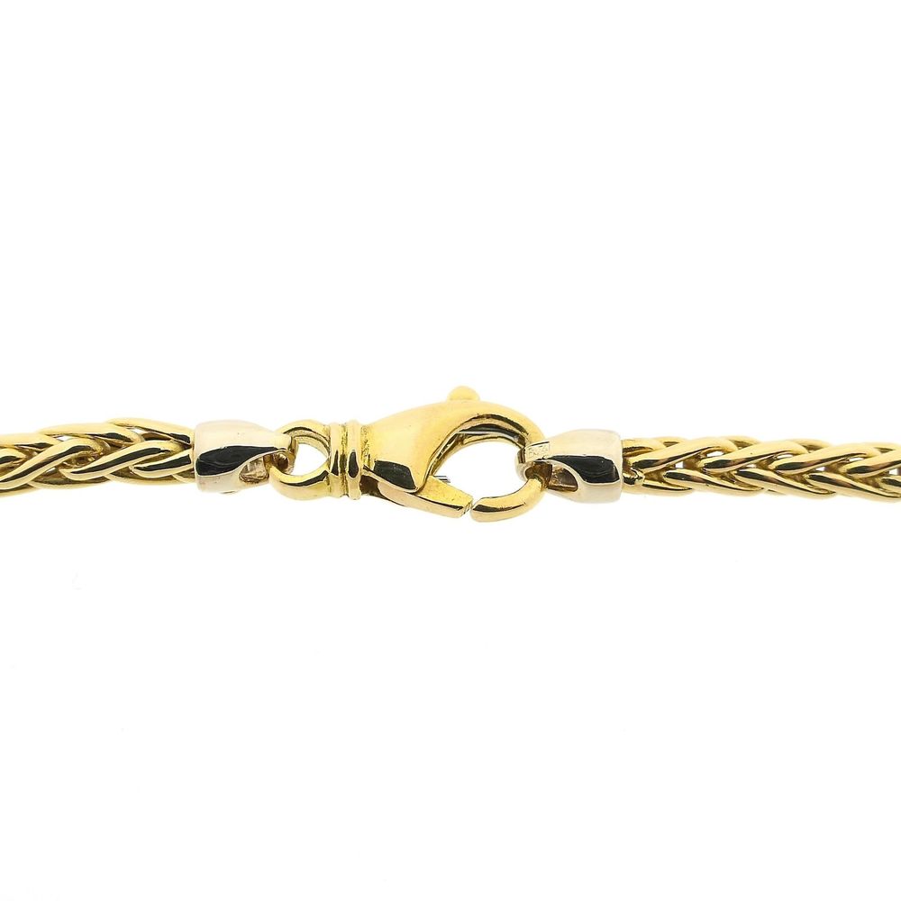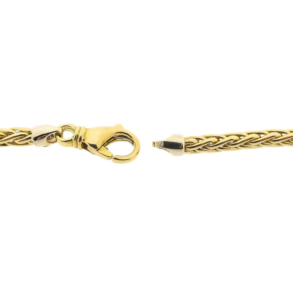 Gold square foxtail link necklace. This timeless and versatile necklace can be worn solo or layered with other necklaces and/or a pendant. The necklace drapes smoothly around the neck. The foxtail link is a round braided gold wire. The ends of the chain are set with a closed white gold eyelet. The piece closes with a lobster clasp and is crafted from 18-karat yellow gold (750/1000).