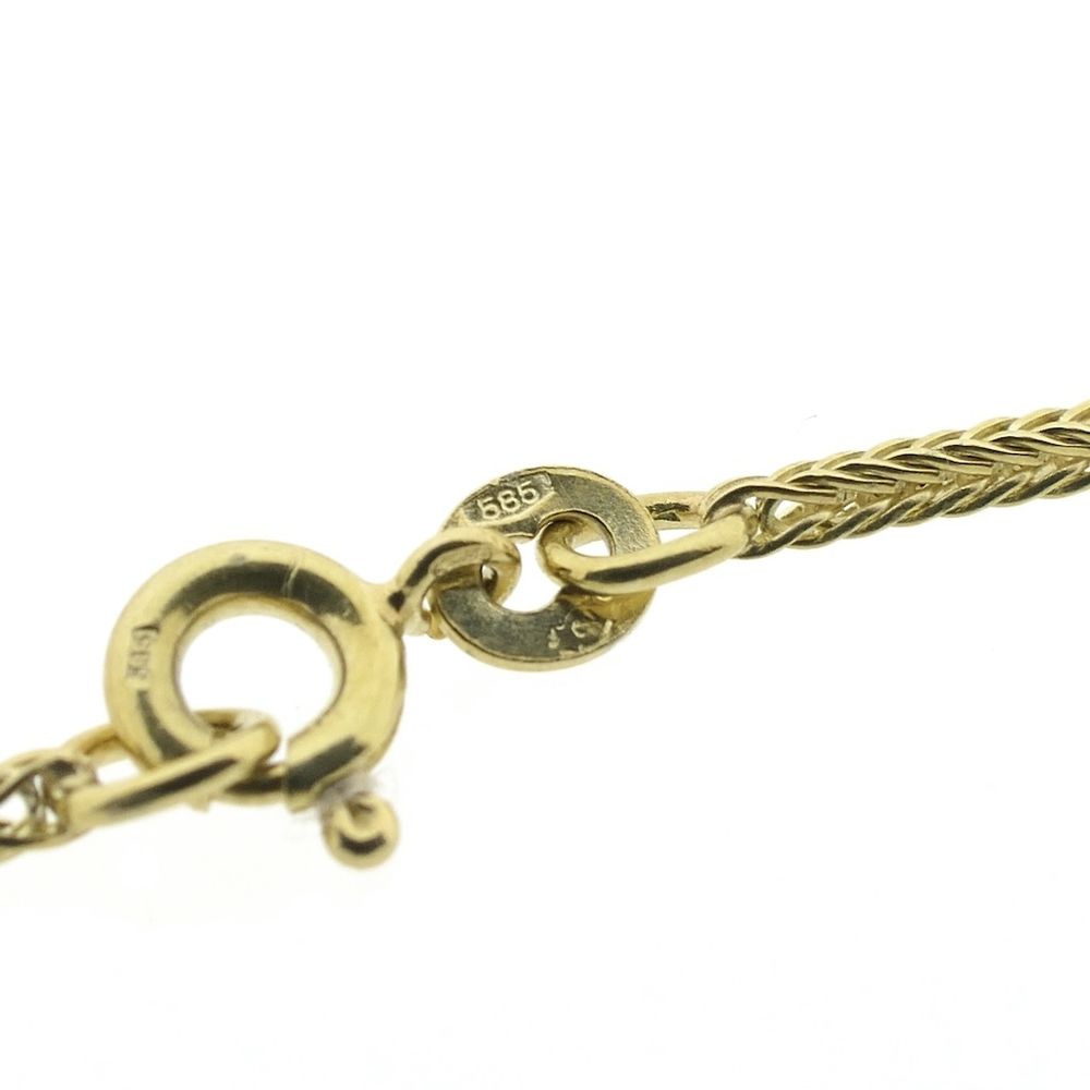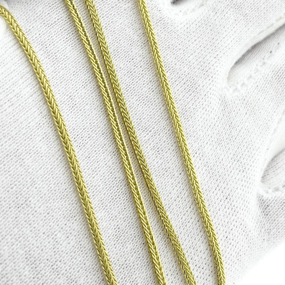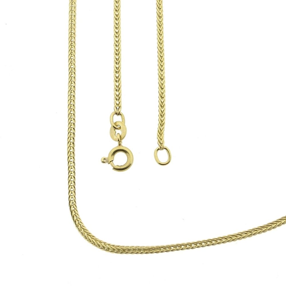Gold square foxtail link necklace. This timeless and versatile necklace can be worn solo or layered with other necklaces and/or a pendant. The necklace drapes smoothly around the neck. The foxtail link is a round braided gold wire. The piece closes with a spring ring and is crafted from 14-karat yellow gold (585/1000).