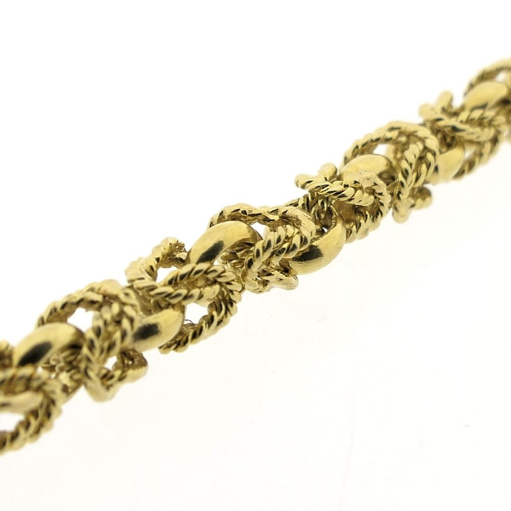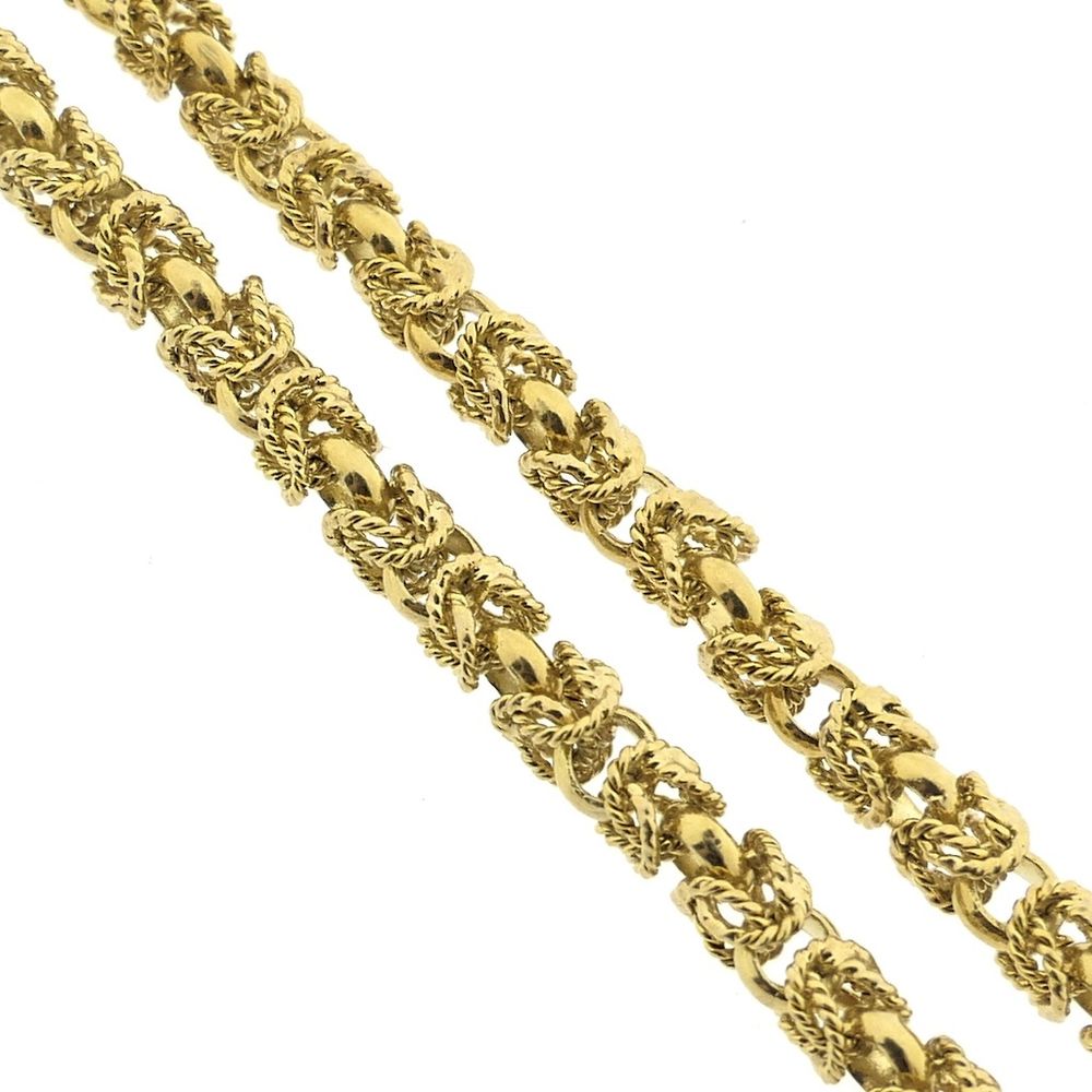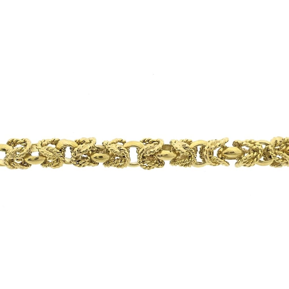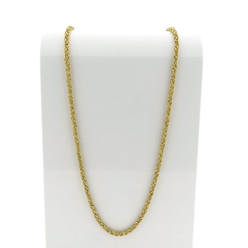 A square gold necklace made with royal links, also known as Byzantine links. The linkwork looks intricate and luxurious, and the design even dates back to the 5th century! These links are further enhanced with a rope pattern, giving them a vintage look. This beautiful long necklace has no clasp. It is crafted from 14-karat yellow gold (585/1000).