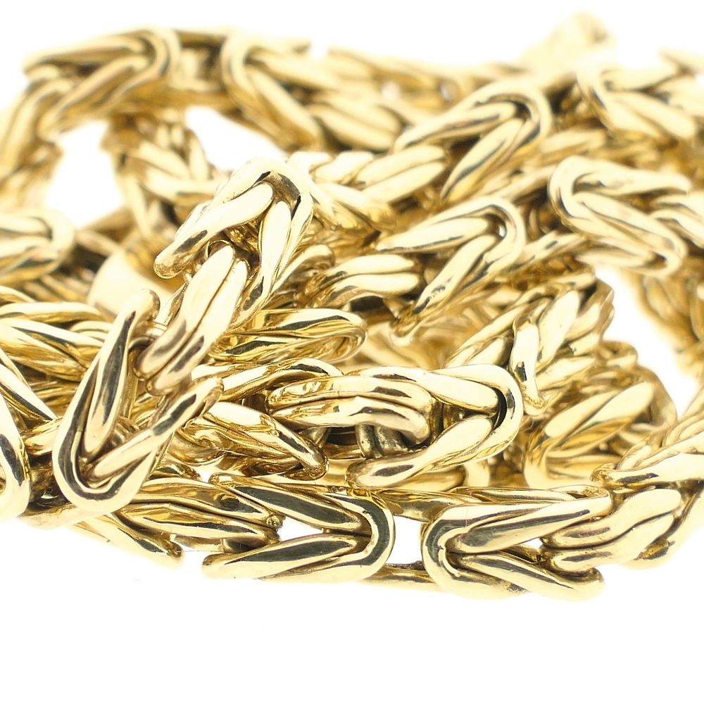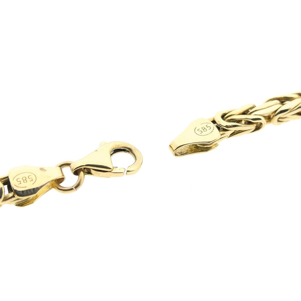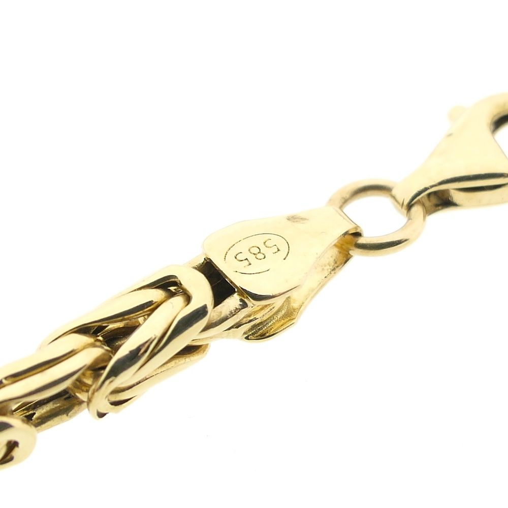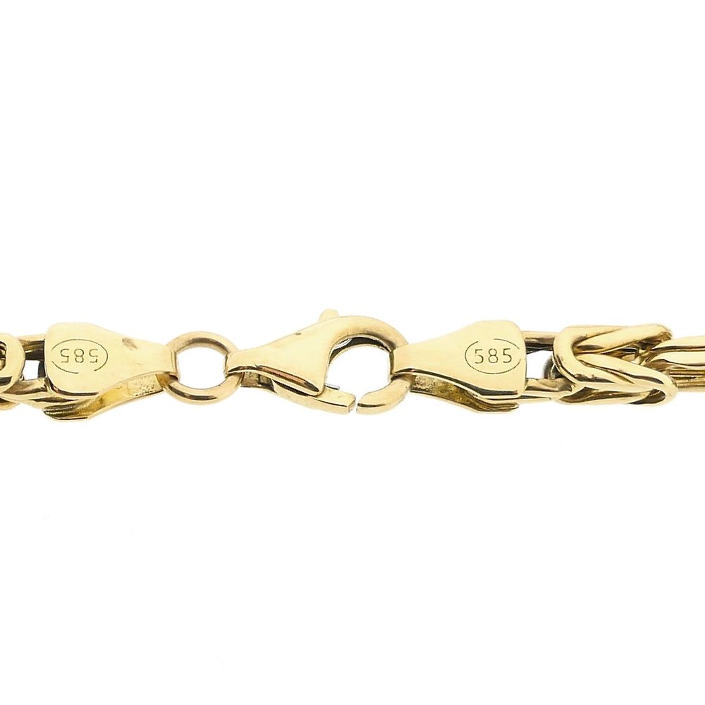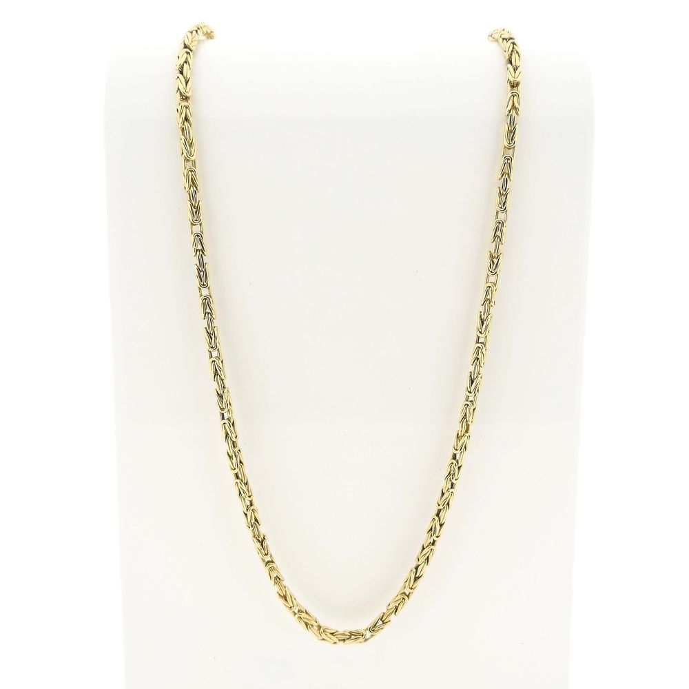 A square gold chain made with royal links, also known as Byzantine links. The linkwork looks intricate and luxurious, and the design even dates back to the 5th century! This beautiful men's necklace closes with a lobster clasp. Crafted from 14-karat yellow gold (585/1000), it is a true gemstone.