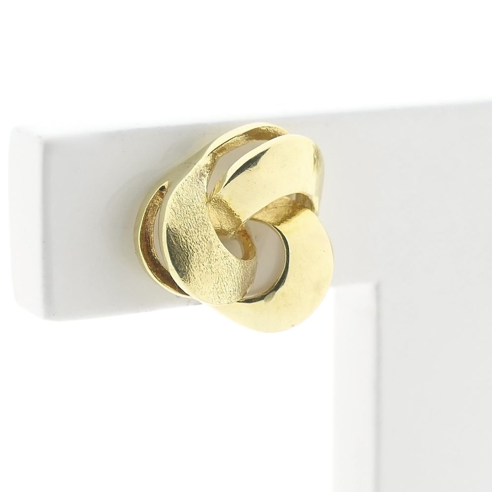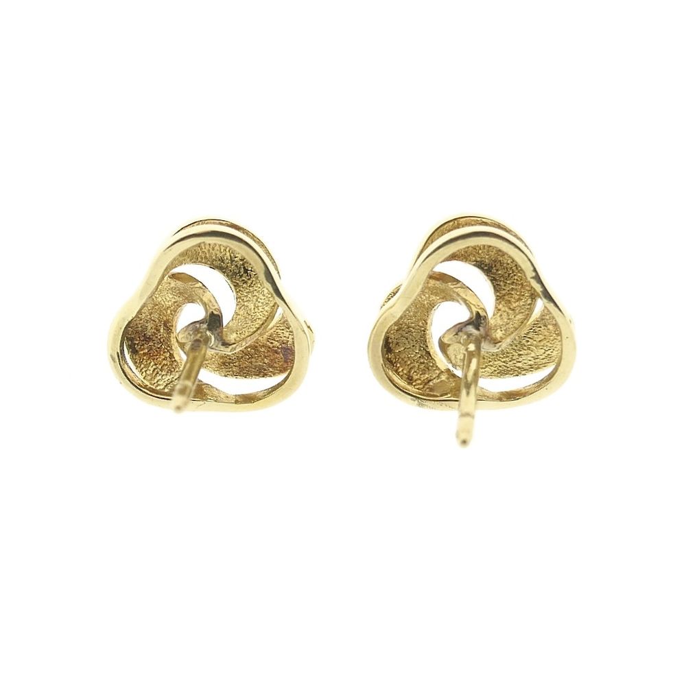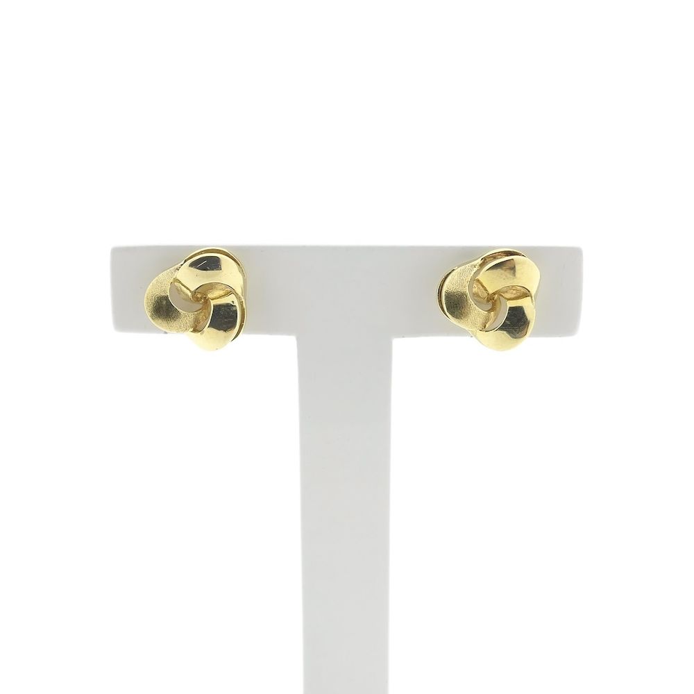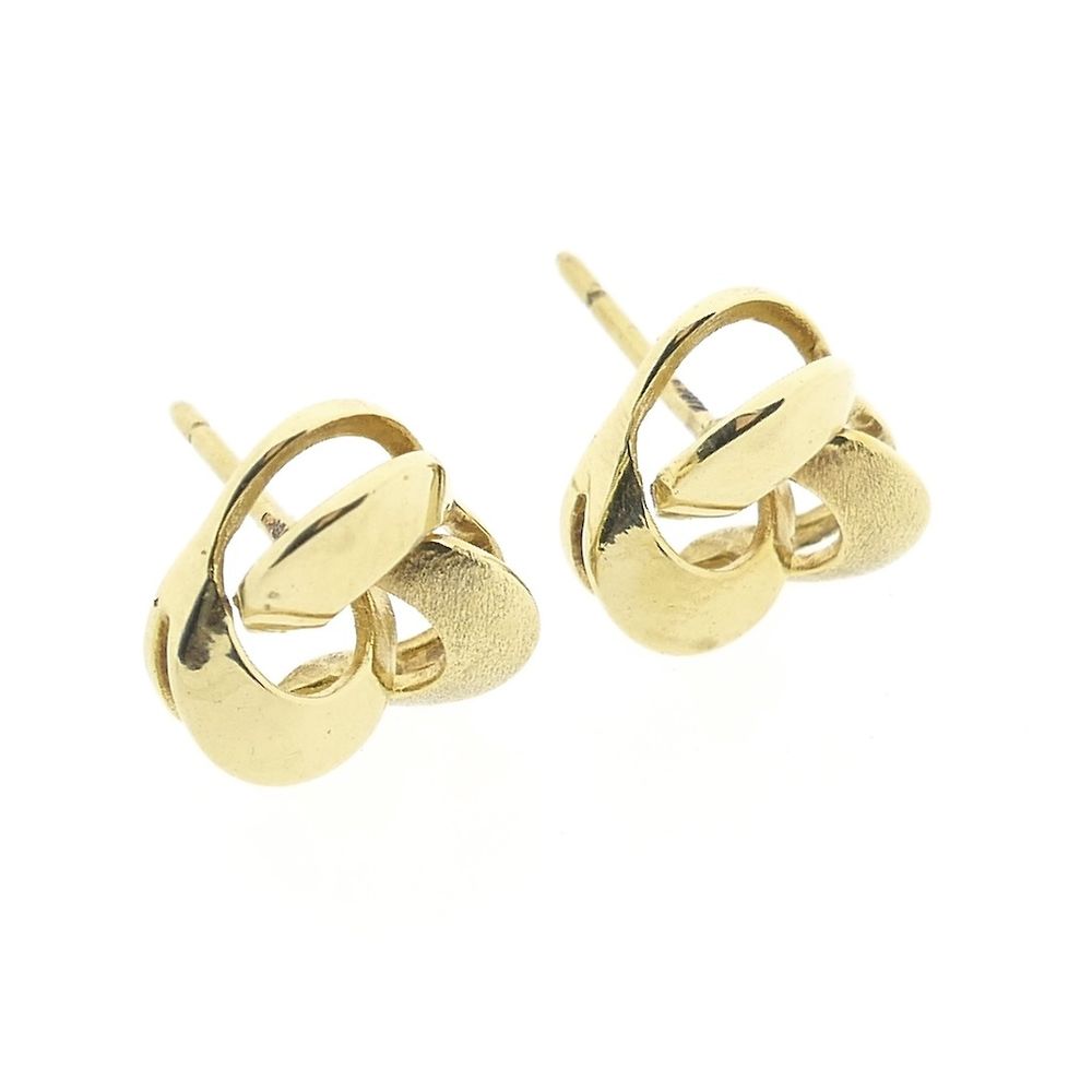 A set of gold stud earrings in the shape of a button. The studs have an artistic design and are partially matted. A charming set of studs crafted from 14-karat yellow gold (585/1000).