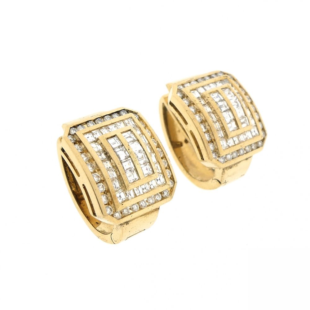 Gold stud earrings set with round brilliant-cut and baguette-cut natural diamonds with a total weight of 3.92 ct. The diamonds are of good quality. The studs are relatively heavy. This luxurious set is crafted from 18-karat yellow gold (750/1000).