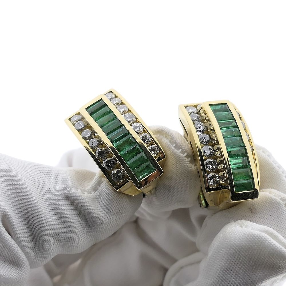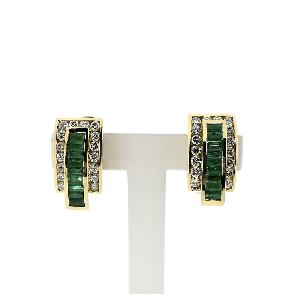 Gold stud earrings set with emeralds and natural diamonds. The emeralds are a bright green color and baguette-cut. Surrounding them are clear, round, brilliant-cut diamonds weighing a total of 1.92 ct. A beautiful combination of gemstones and gold. The stud earrings are crafted from 18-karat yellow gold (750/1000).