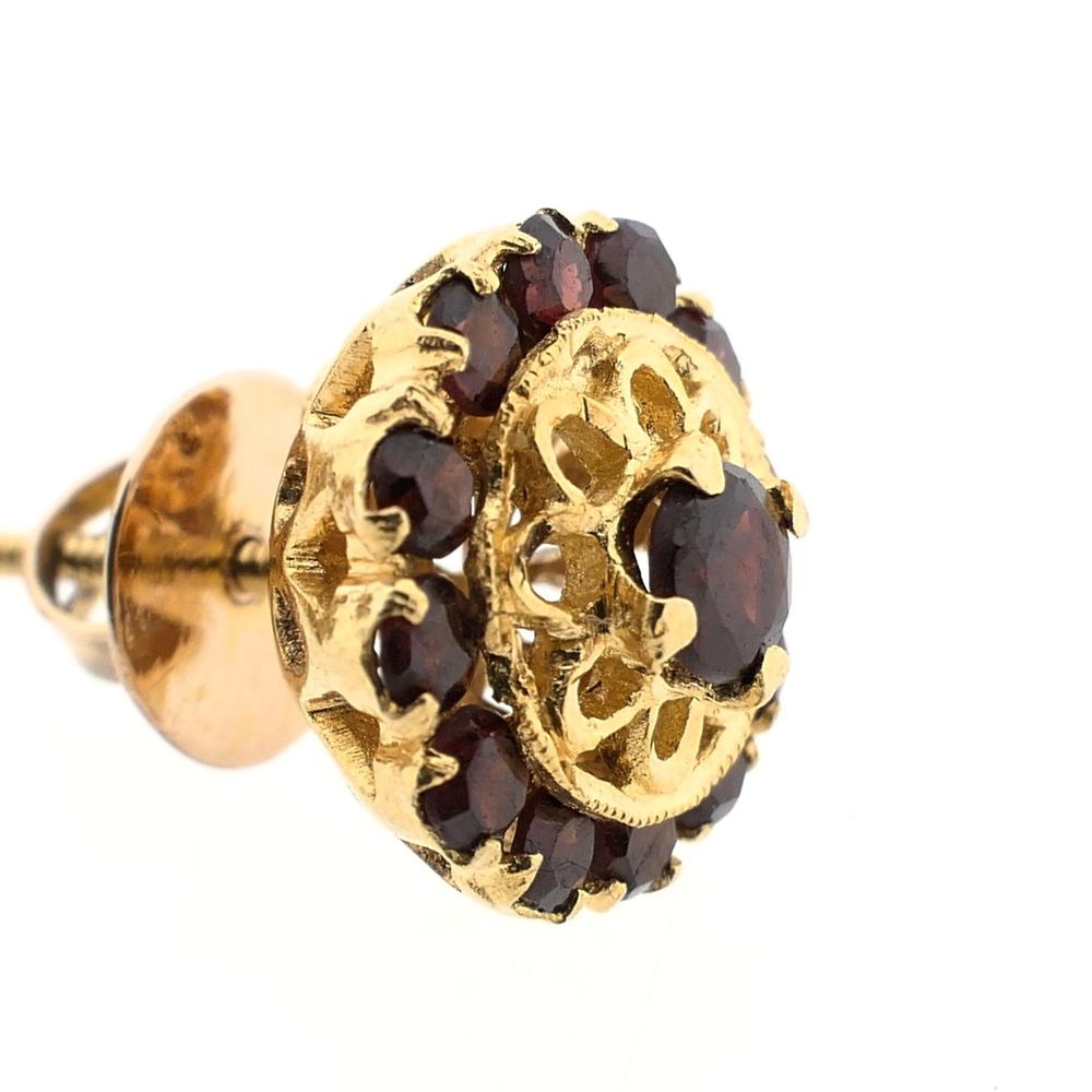 Gold stud earrings set with garnet stones, arranged in a flower shape. The clasp is a screw-on butterfly. Note: the butterfly studs are not identical. The earrings are crafted from 18-karat yellow gold (750/1000).