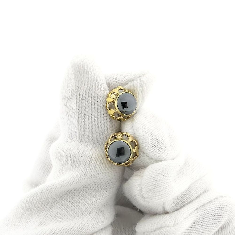 A set of gold stud earrings set with hematite. Hematite has a dense metallic black color. The setting gives the jewelry a vintage and classic look. The stud earrings are crafted from 14-karat yellow gold (585/1000).