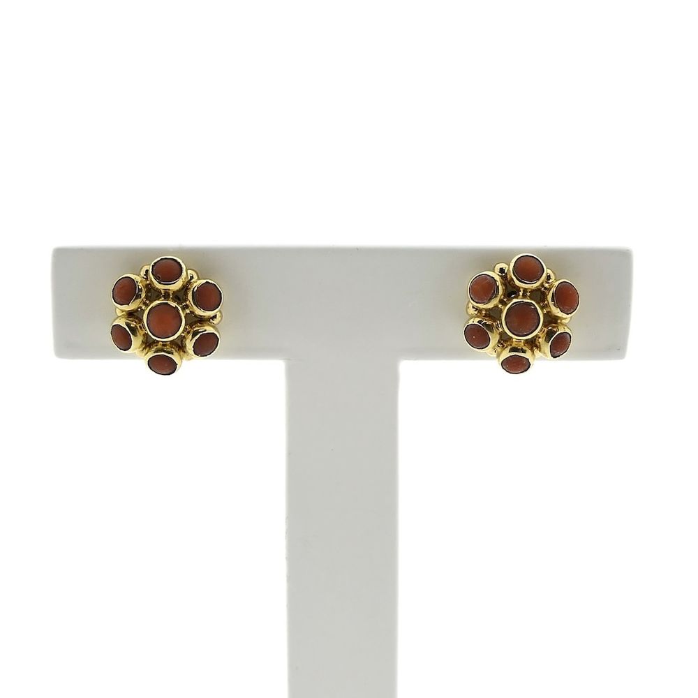 Vintage gold stud earrings set with blood coral. A beautiful and classic set of stud earrings with an antique look. Crafted from 14-karat yellow gold (585/1000).