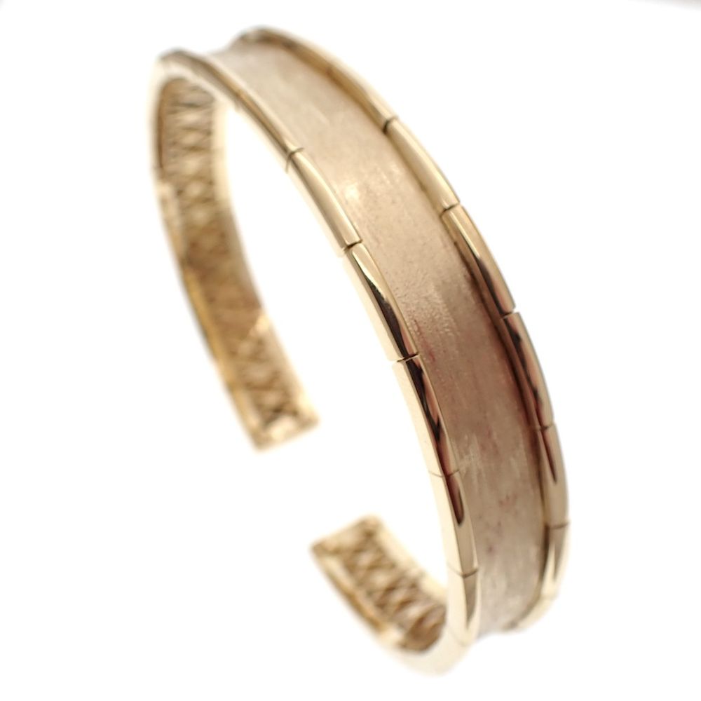 Solid gold clamp bracelet. The bracelet has a coarse matte finish on the outside with shiny edges. The inside is decorated with diamonds. It is a solid and substantial piece of jewelry with a luxurious look. The bracelet is crafted from 18-karat yellow gold (750/1000).