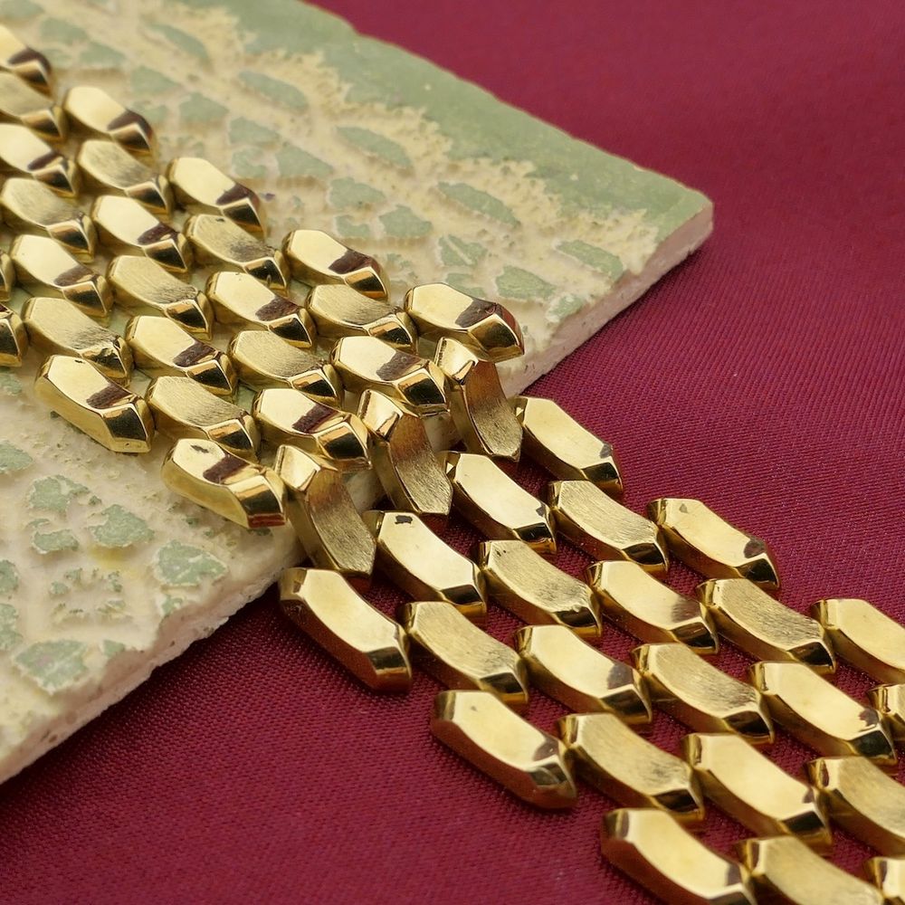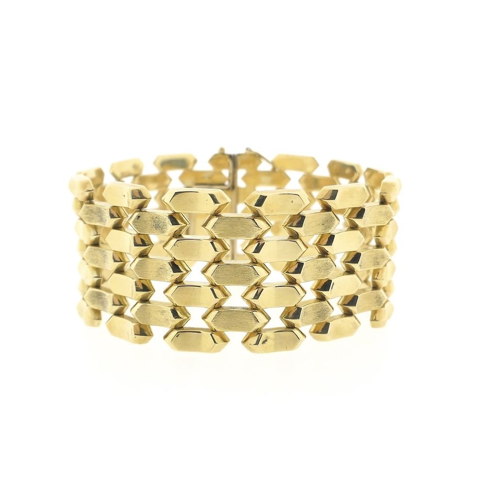 Gold wide Bismarck link bracelet. The bracelet has a link width of 30.2 mm. It is a solid piece of jewelry with a luxurious appearance. The links have both a matte and smooth finish. The bracelet closes with a box clasp with two safety hooks. The piece is made of 14-karat yellow gold (585/1000).