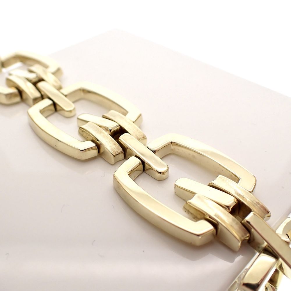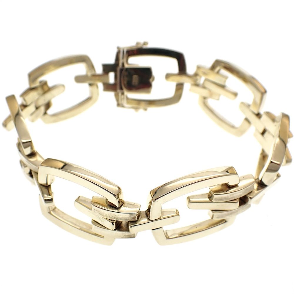 Luxurious wide link bracelet with a unique design. The bracelet features large open links and a link width of 20.3 mm. A beautiful and striking piece of jewelry crafted from 14-karat yellow gold (585/1000).