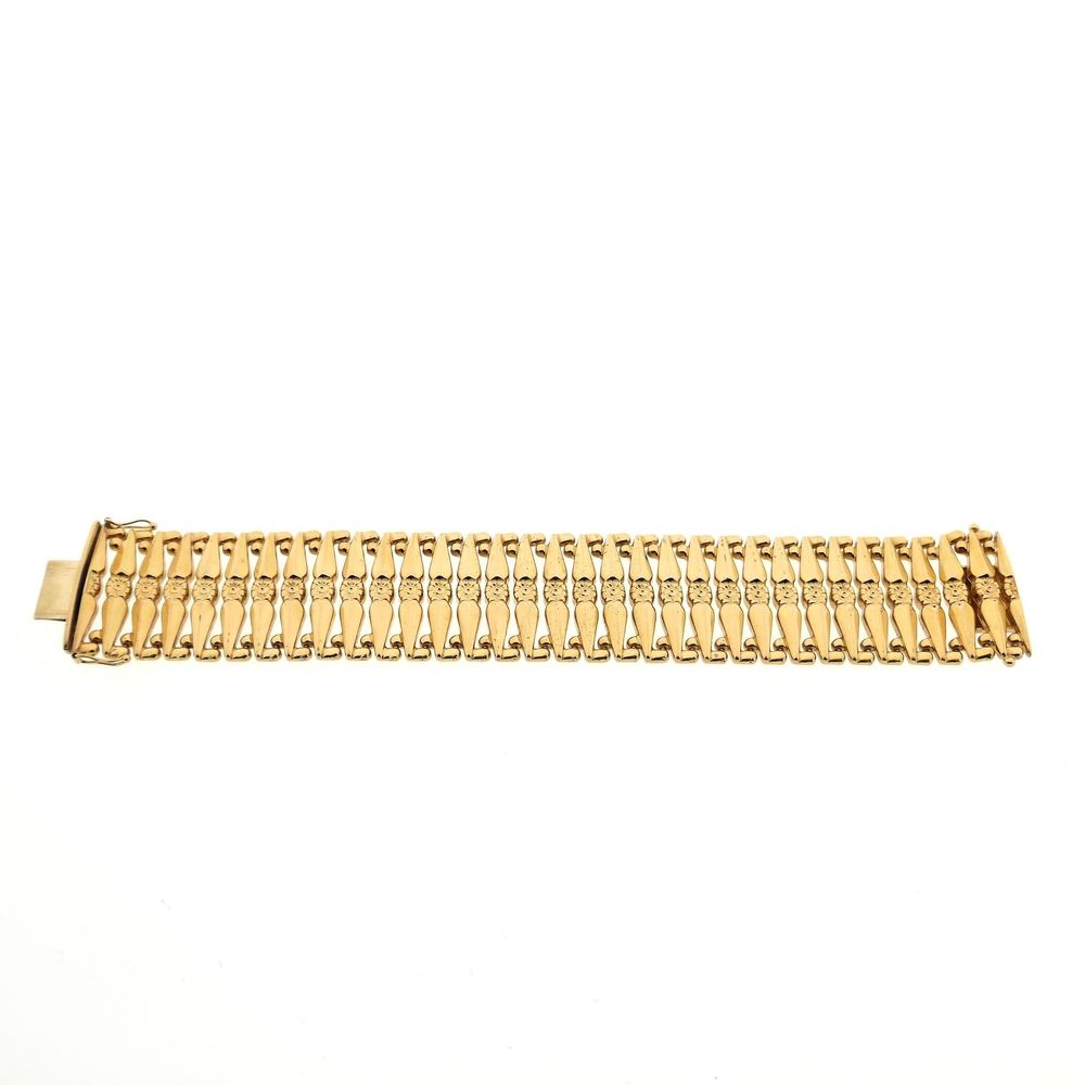 A wide gold bracelet with unique links. The bracelet is solidly crafted and closes with a box clasp and safety hooks. Crafted from 18-karat yellow gold (750/1000), it has a luxurious appearance.