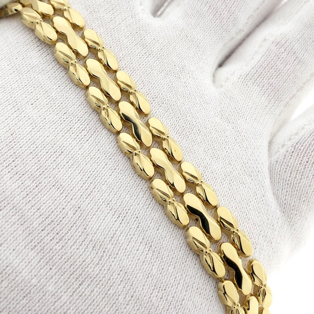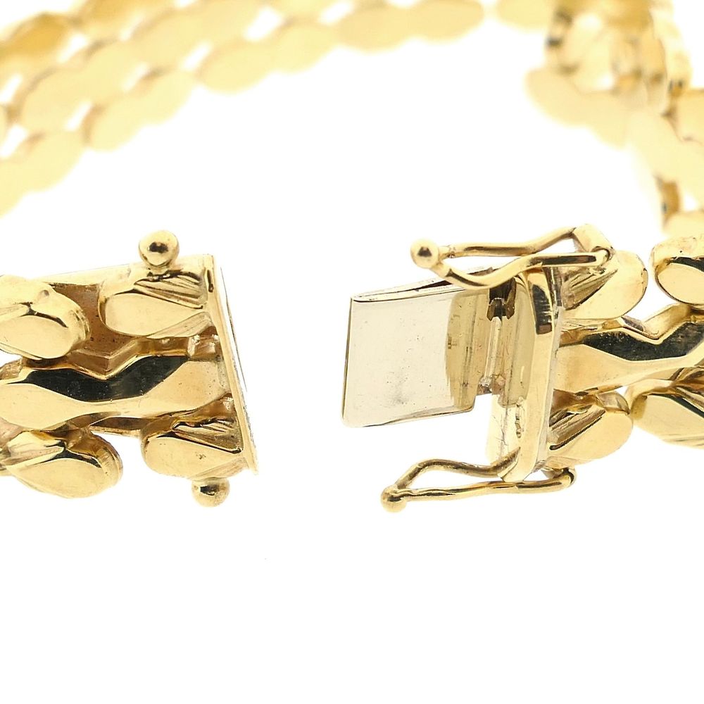 Golden Bismarck link bracelet. The links are both robust and flexible. The design is timeless and can be worn both solo and in combination with other bracelets. A beautiful piece of jewelry with an elegant appearance. The bracelet is made of 14 karat yellow gold (585/1000).
