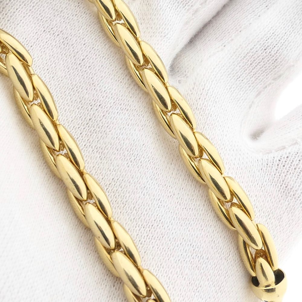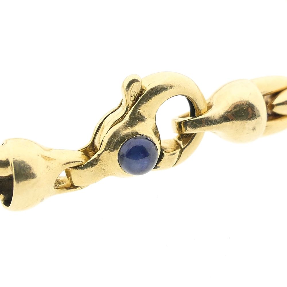 Golden Cardano link bracelet. A Cardano link has a scale-like, stylish appearance and this bracelet has a link width of 6.4 mm. The bracelet closes with a lobster clasp set with two round cabochon-cut sapphires and is made of 14 karat yellow gold (585/1000).