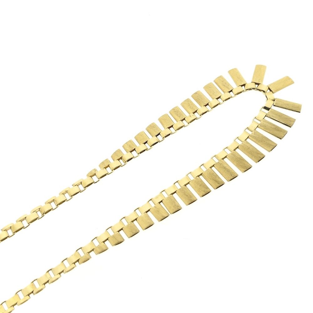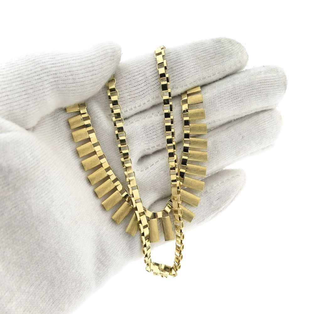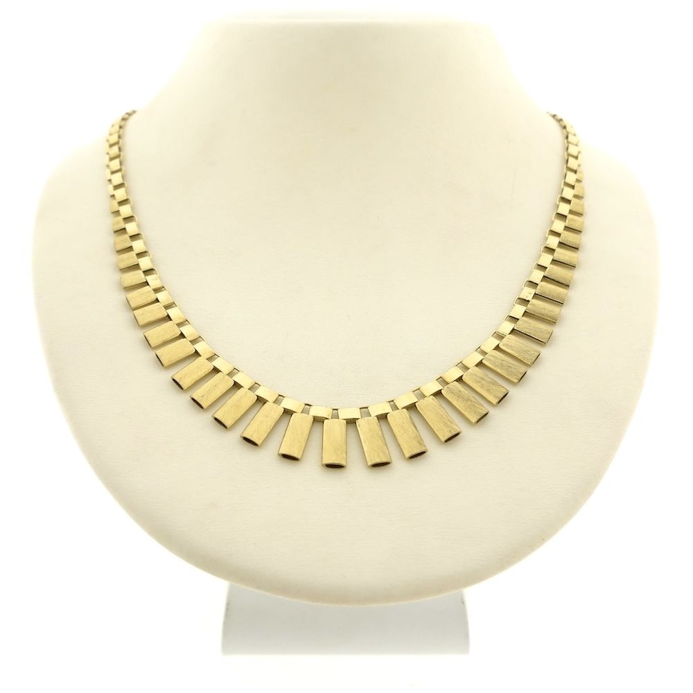 Exclusive gold Cleopatra necklace. The frosted bars are hollow inside and taper from 4.5 mm to 13.9 mm in the center. It's a necklace that moves smoothly, allowing it to drape beautifully across the neck. This elegant women's necklace closes with a box clasp and safety hook and is crafted from 14-karat yellow gold (585/1000).