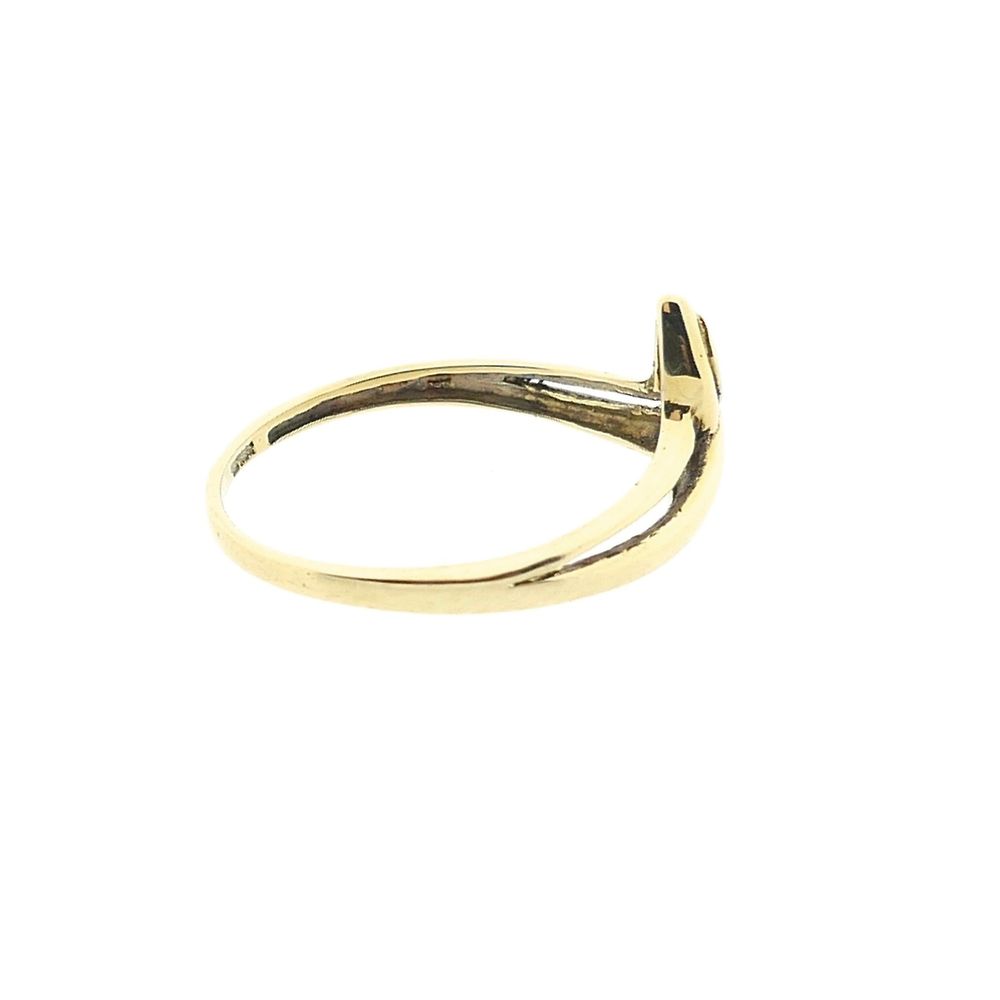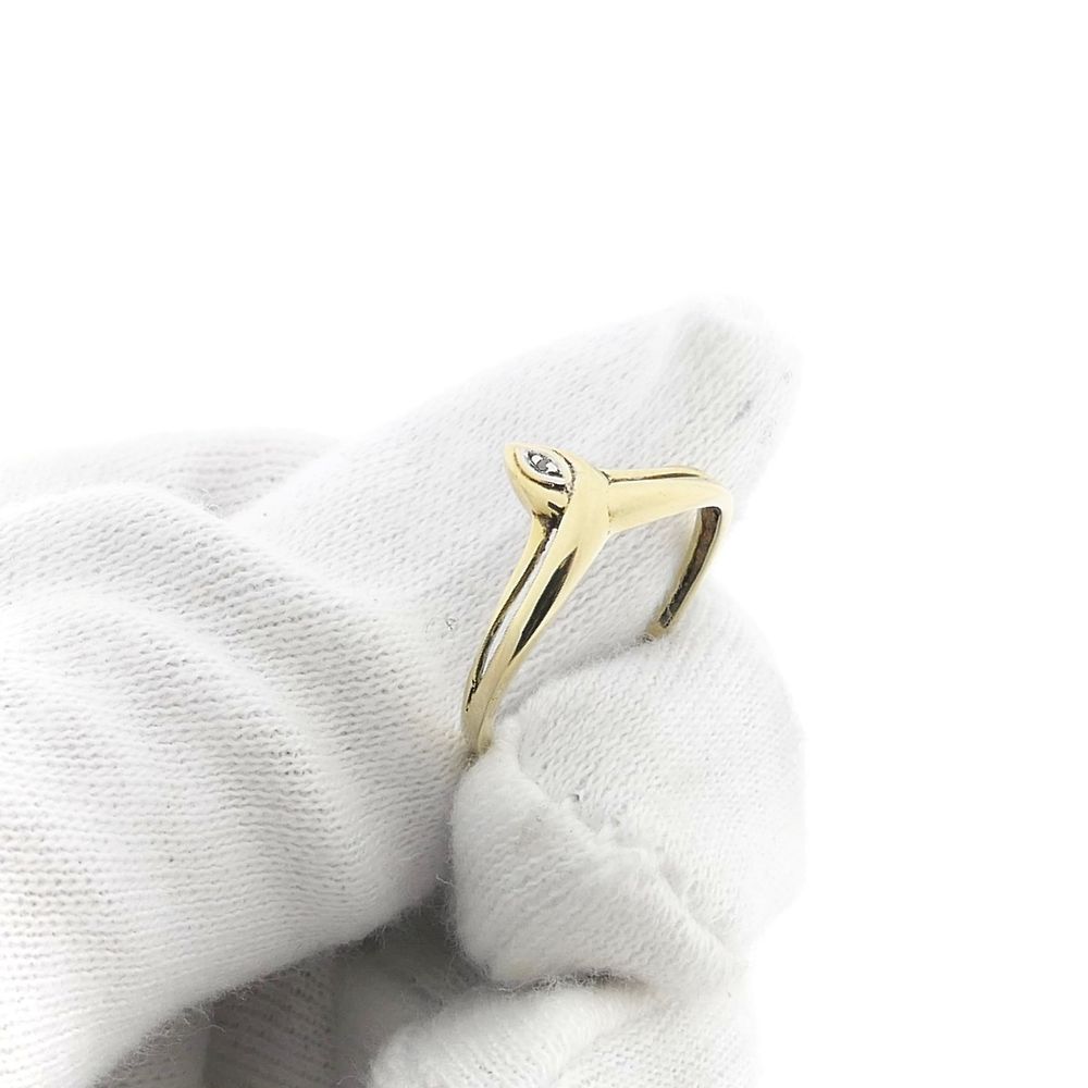 Golden decorative ring set with a 0.005 ct. diamond. The diamond is set in a white gold droplet-shaped setting. The ring is made of 14 karat yellow gold (585/1000).