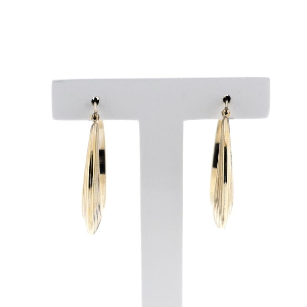 A set of gold earrings engraved with dynamic lines. A modern set to complete your look. The earrings close with a snap closure and are crafted from 14-karat yellow gold (585/1000).