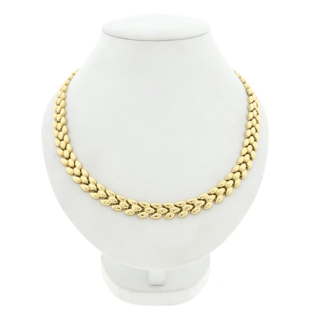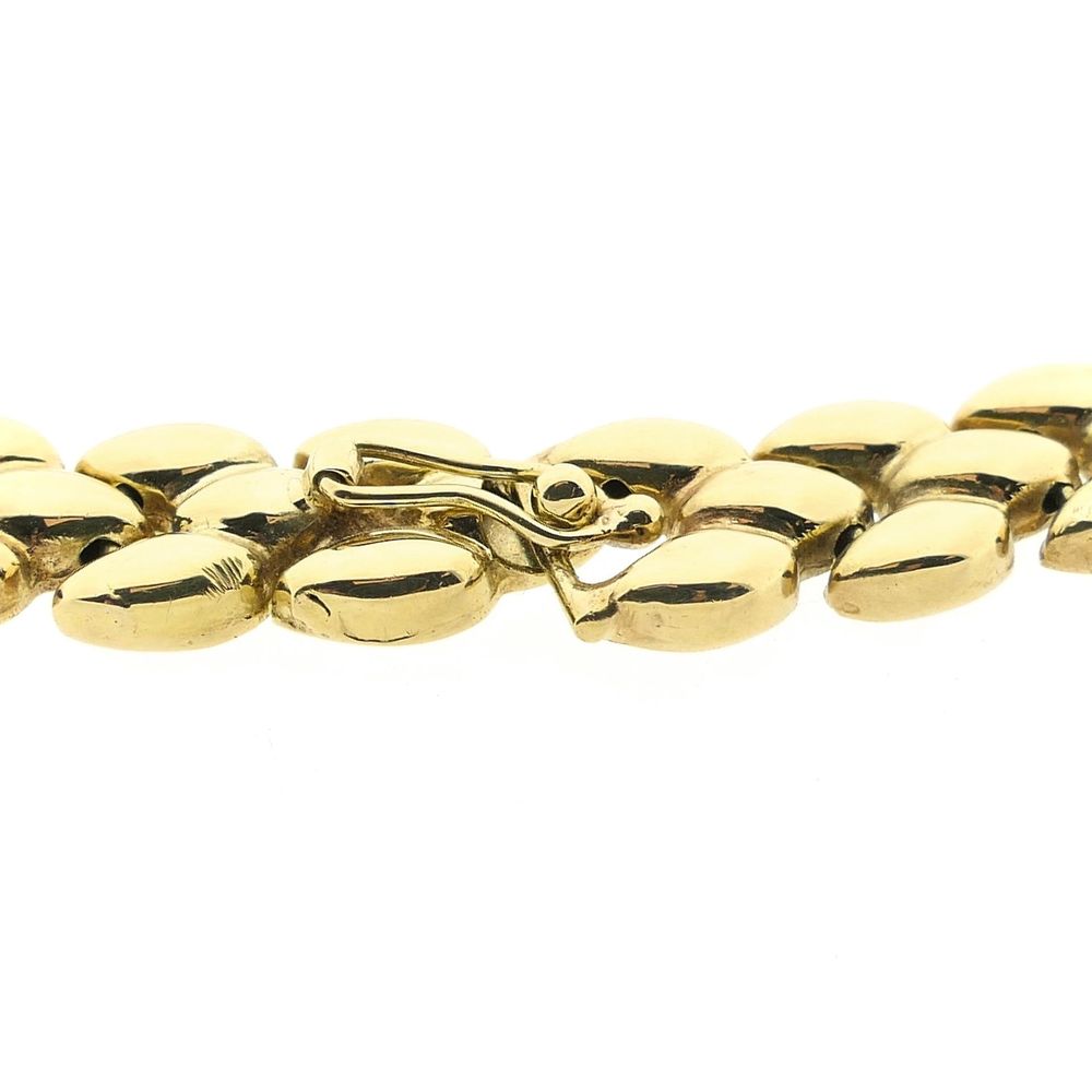 Golden fantasy link necklace. The links are shaped like leaves and the chain is smoothly finished. A beautiful piece of jewelry to wear around the neck. This striking ladies' necklace closes with a fantasy spring ring clasp including a safety hook and is made of 14 karat yellow gold (585/1000).