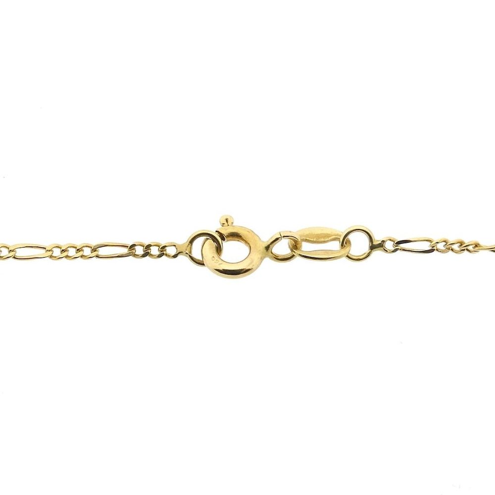 Gold Figaro link necklace. The Figaro link is recognizable by the longer link between every three (or sometimes even more) gourmet links. The name of the link is derived from the protagonist, Figaro, from the Italian opera "Barber of Seville." It is a solid and timeless link. This beautiful necklace is crafted from 18-karat yellow gold (750/1000).