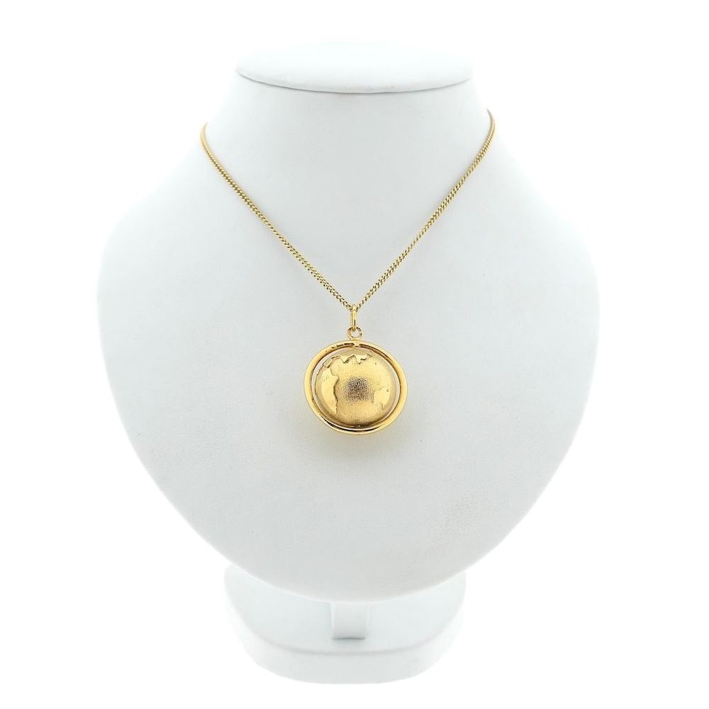 Gold pendant of a rotating globe. The pendant features four different continents in a matte relief. A beautifully detailed piece of jewelry. The pendant is crafted from 14-karat yellow gold (585/1000). Optional extra: If desired, we can have diamonds set on countries you've visited or still want to visit. Other ideas are, of course, open to discussion. For any questions or to discuss your wishes, please contact us. We'll see what we can do for you.