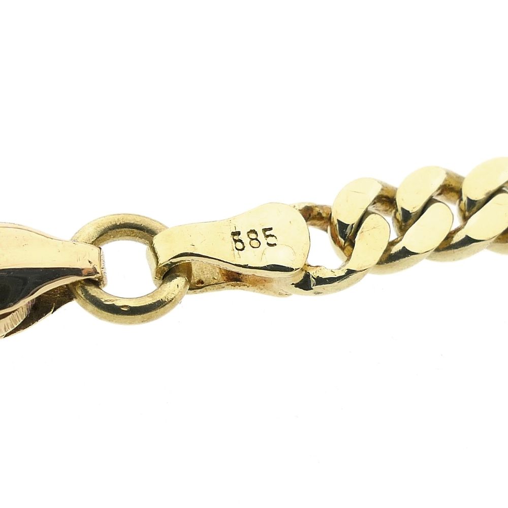 Golden gourmet/fantasy link bracelet. It is a flexible and solid bracelet with a robust appearance. After every six gourmet links, a fantasy link is set. The bracelet fastens with a lobster clasp and is made of 14 karat yellow gold (585/1000).