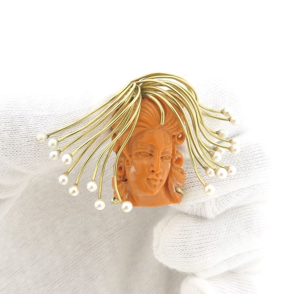 Gold pendant featuring the head of Medusa in red coral with pearls. The red coral is cut into a feminine face, and the pendant is beautifully crafted with yellow gold strands representing hair and cultured pearls at the ends. The reverse side of the pendant is completely smooth. The pendant has a small eyelet and is only suitable for a thin chain with a small eyelet. The second eyelet is slightly larger. It is a beautiful pendant crafted from 14-karat yellow gold (585/1000). Medusa is a Greek mythology piece from a tragic story. Over the years, views on Medusa have changed, including Gianni Versace (of the luxury brand Versace). Gianni deliberately chose Medusa for his logo because it exudes strength and courage.