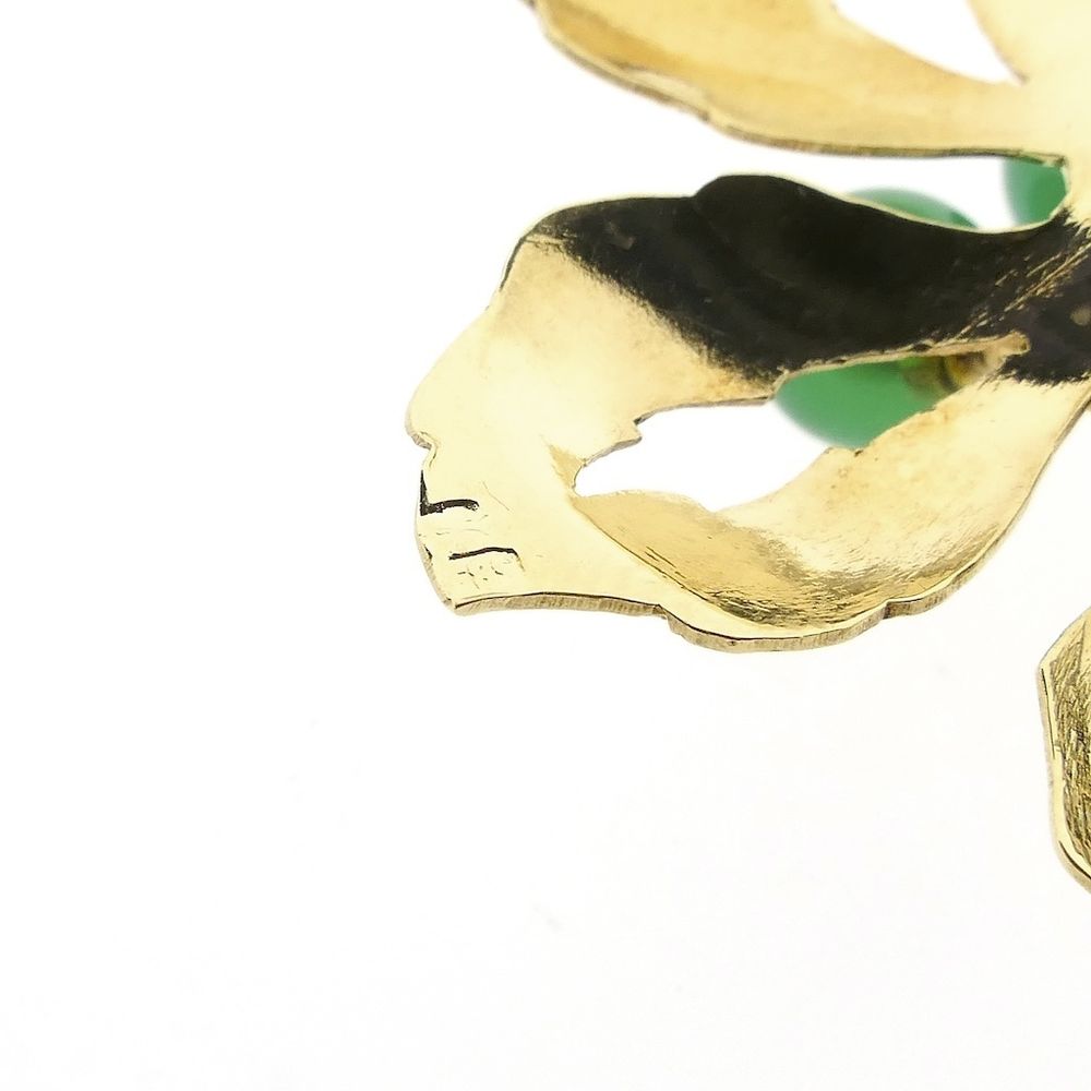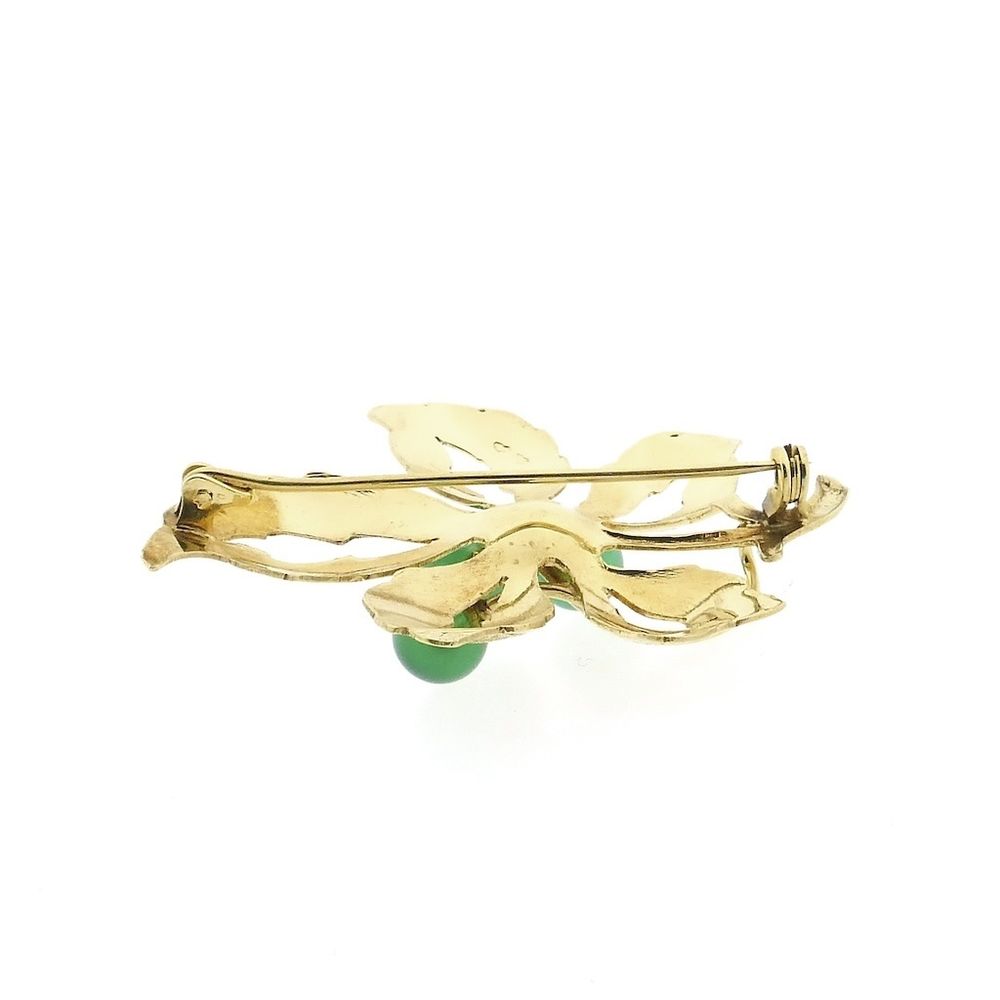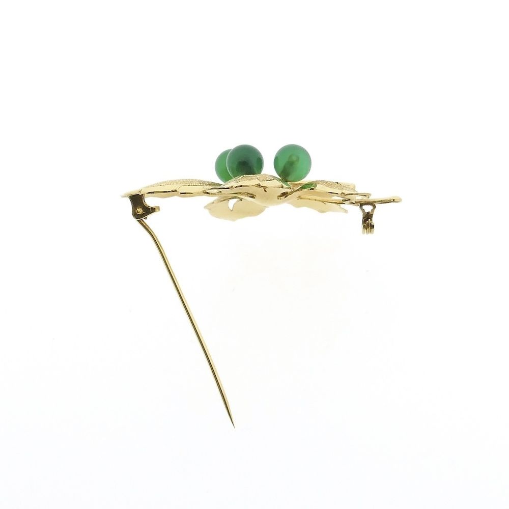 Floral gold brooch designed as an oak leaf. The leaves are detailed with a delicately engraved texture, and the center of the leaf is set with three round cabochon-cut Imperial jade gemstones. This beautiful accessory is crafted from 14-karat yellow gold (585/1000).