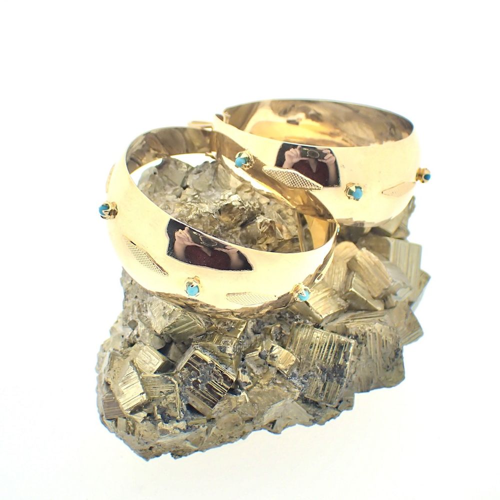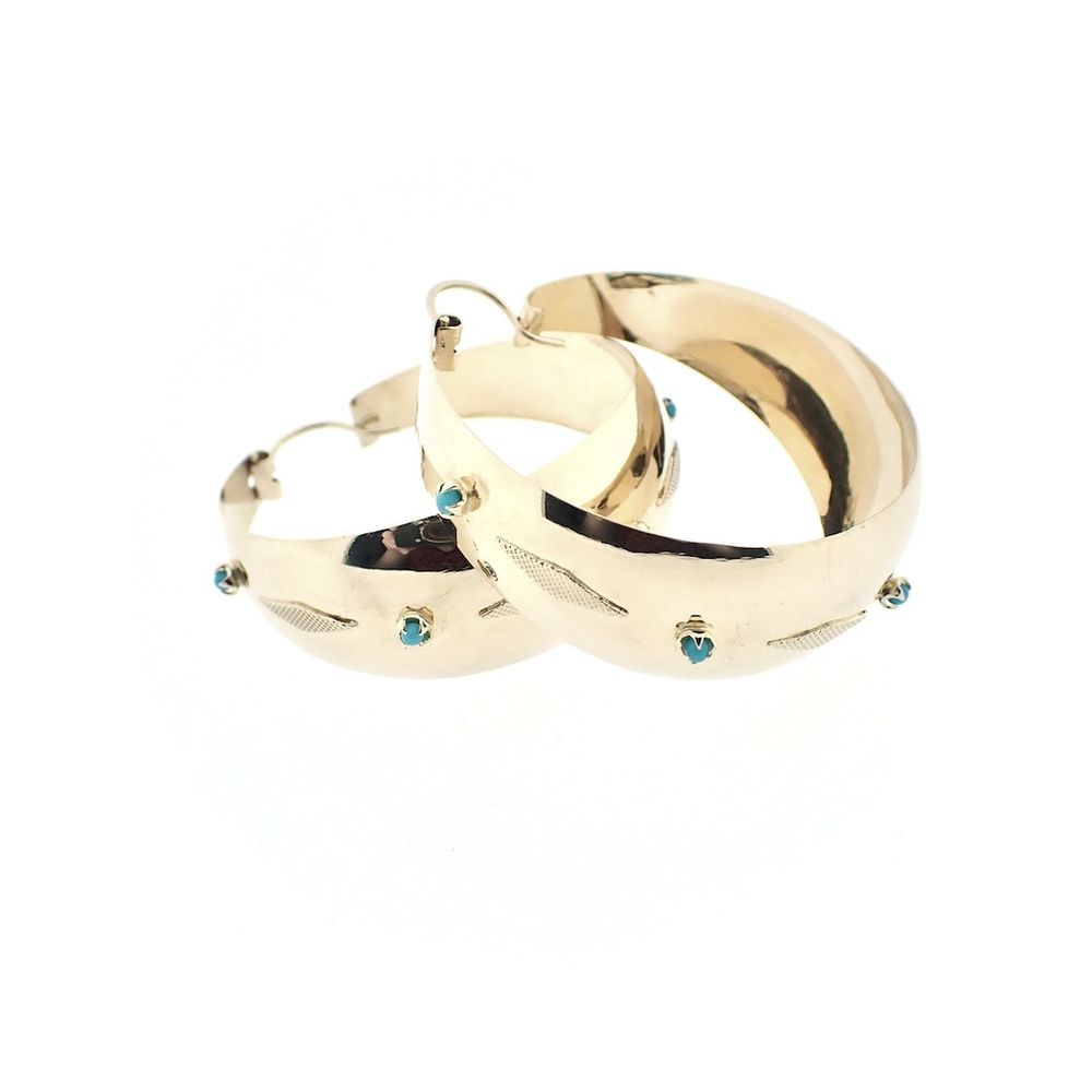 Golden oriental earrings with turquoise; Ø 45 mm