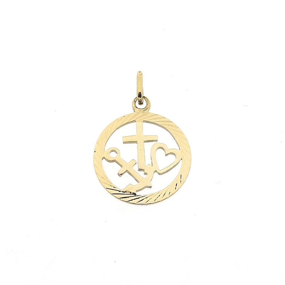 Golden pendant representing faith, hope, and love. The heart symbolizes love, the anchor symbolizes hope, and the cross symbolizes faith. The symbols are set in a round ribbed frame. The pendant is made from 14 karat yellow gold (585/1000).