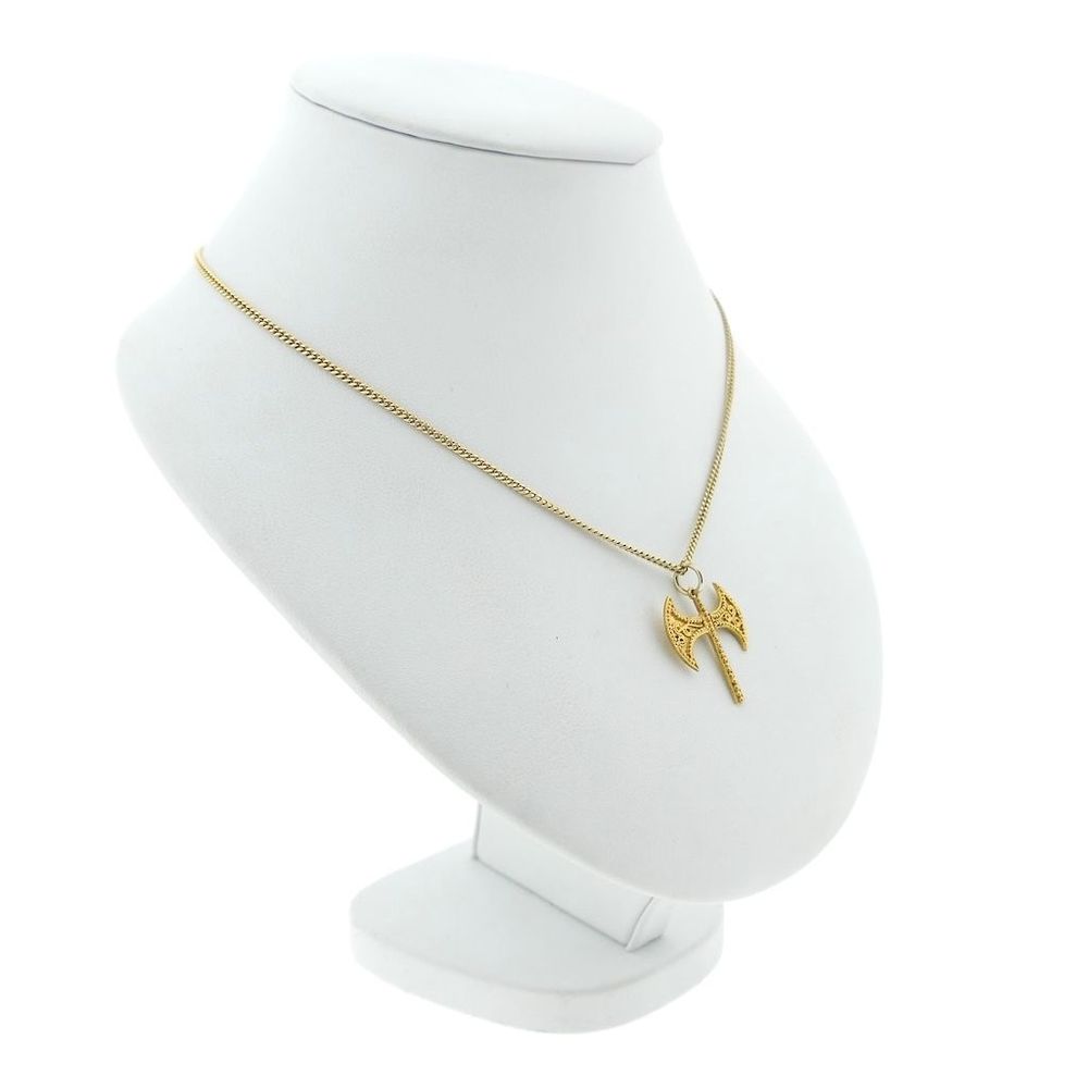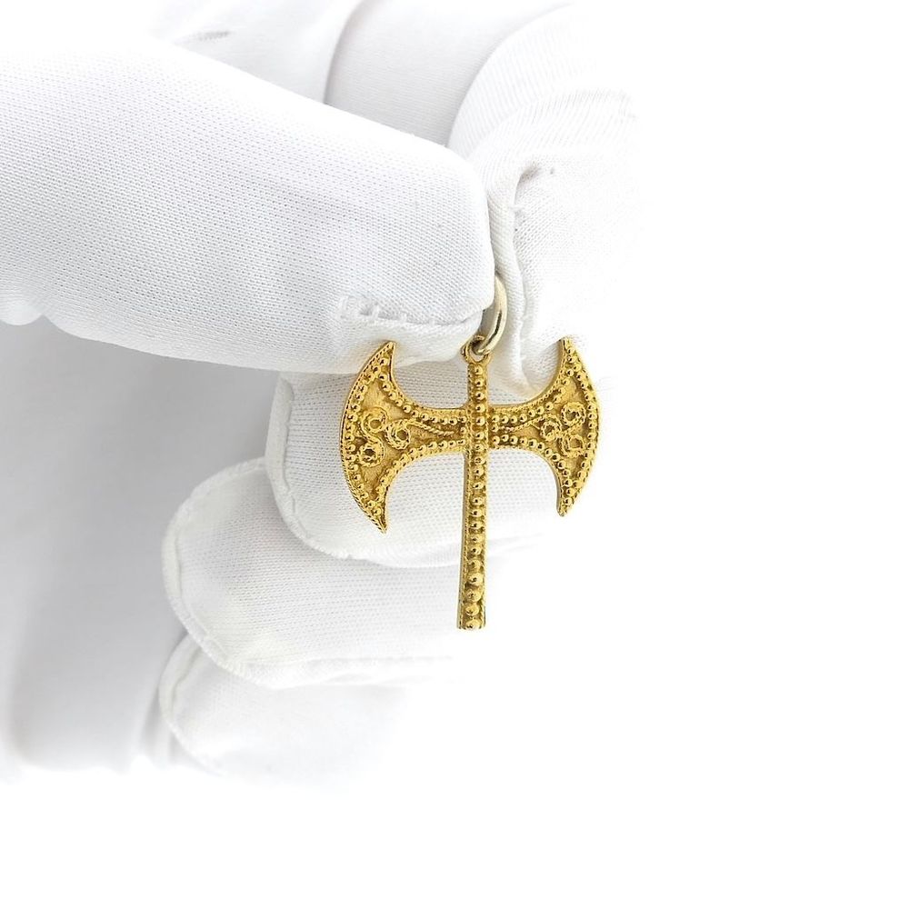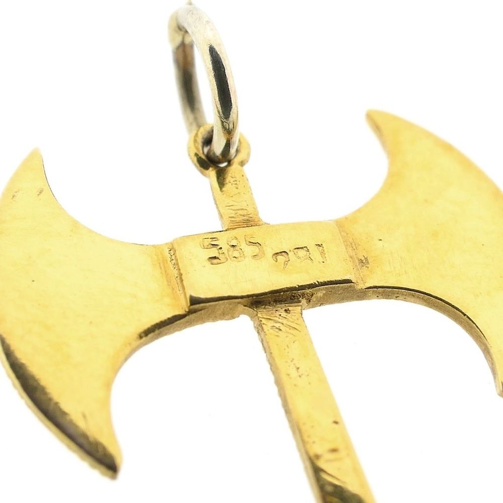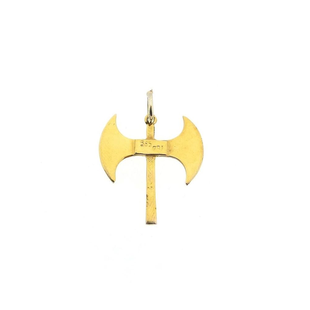Gold pendant of a labrys. The pendant, shaped like a double axe, is intricately crafted and has a smooth finish on the reverse. The pendant is a symbol with a rich history, primarily found in ancient civilizations (particularly Crete), where it primarily held religious or ceremonial significance. It is also associated with Amazonian warriors and sometimes with modern symbolism surrounding strength and feminism. This attractive pendant is crafted from 14-karat yellow gold (585/1000).