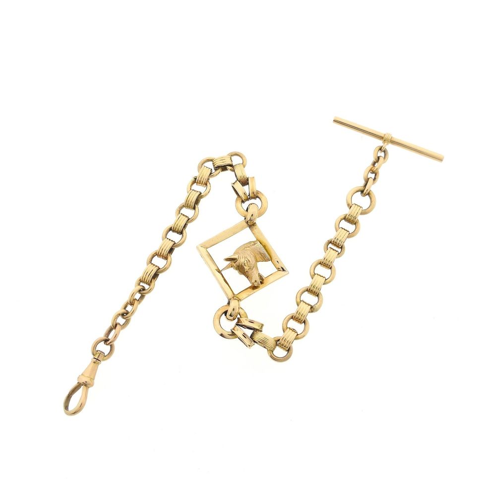 Golden watch chain (chatelaine). It is a traditional accessory originally designed as a practical belt chain in the 18th and 19th centuries. Nowadays, the chatelaine is worn as a watch chain for pocket watches in the chest pocket of a vest or jacket, with the chain visible for a vintage and chic appearance. This timeless chatelaine is made of 14 yellow gold (585/1000).