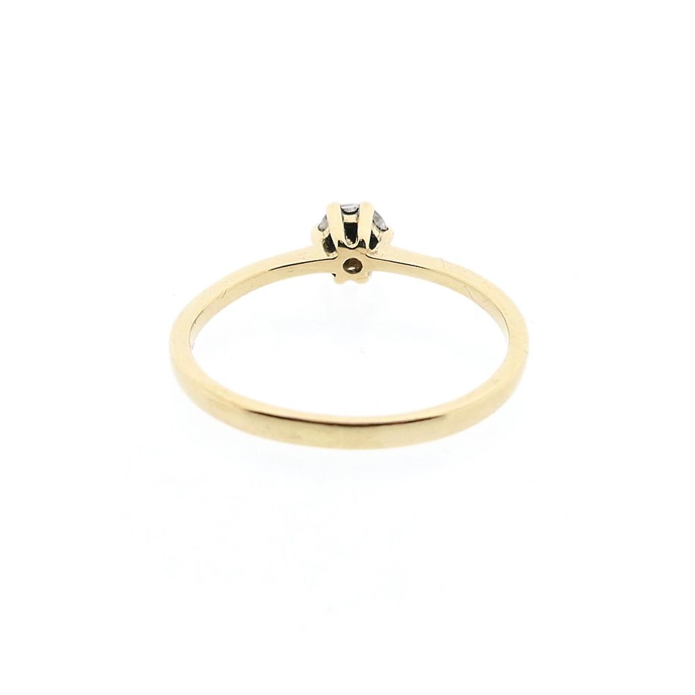 Golden solitaire ring set with a round brilliant-cut zirconia stone. The stone has a diameter of Ø 4.0 mm and is set in a high six-prong chaton. The piece has a subtle appearance and is made from 14-karat yellow gold (585/1000).