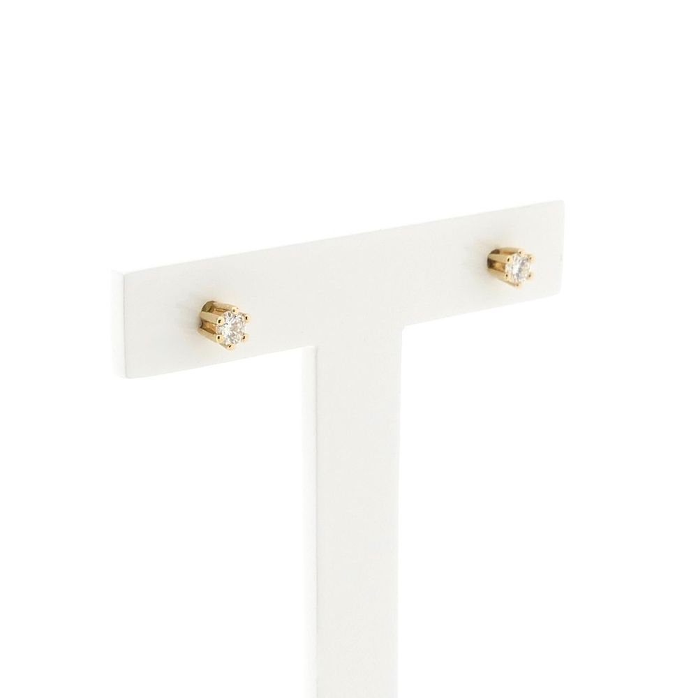 Golden solitaire stud earrings set with a stunning round brilliant cut diamond with a total weight of 0.22 ct. A timeless and elegant pair suitable for wearing solo or combined with other earrings. The stud earrings are made of 14 karat yellow gold (585/1000).