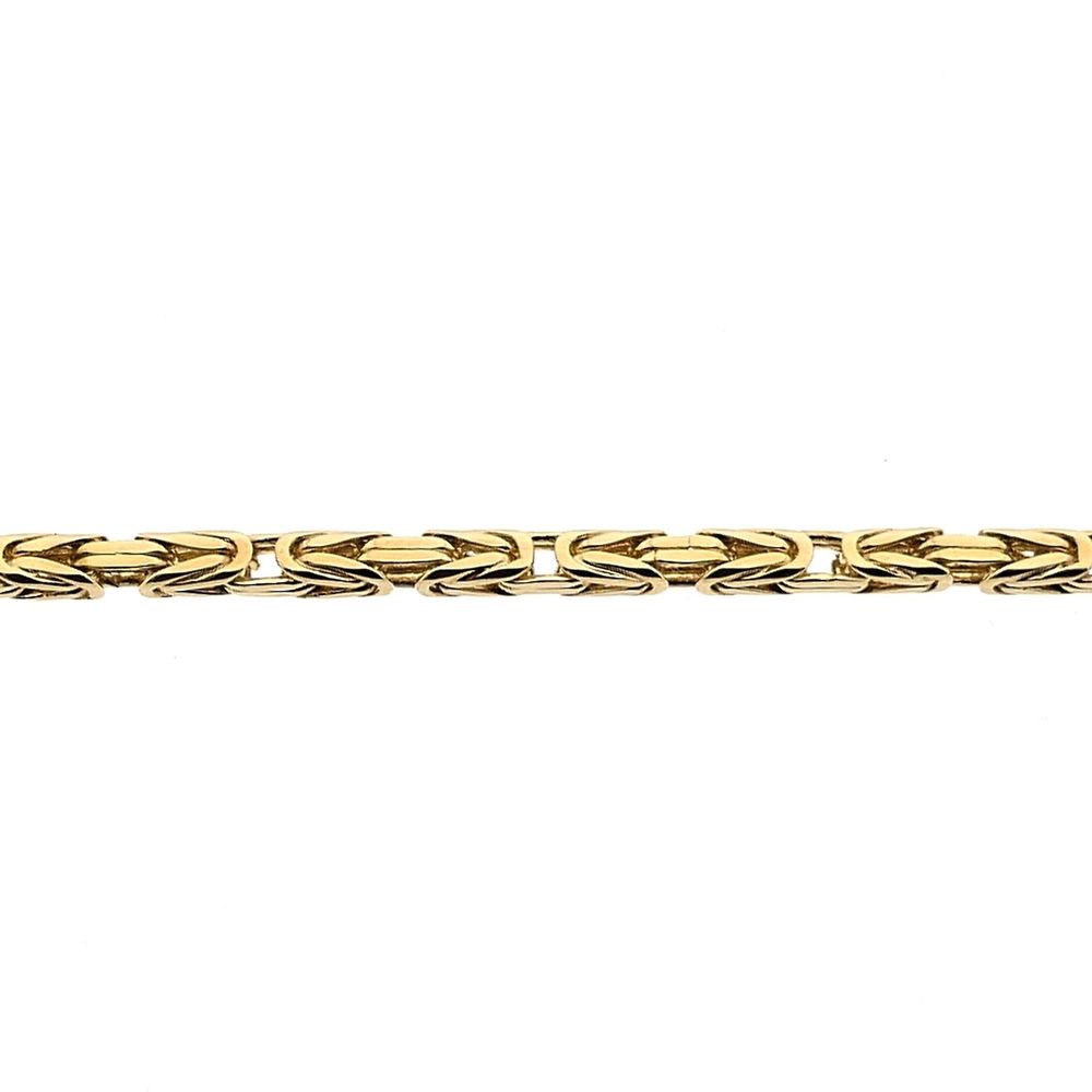 Golden square necklace made with Byzantine links, also known as the kings link. The chain work appears complex and luxurious, and the design dates back to the 5th century! This beautiful necklace fastens with a lobster clasp and is made from 14 karat yellow gold (585/1000).