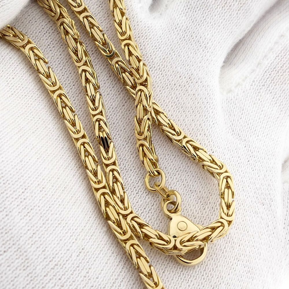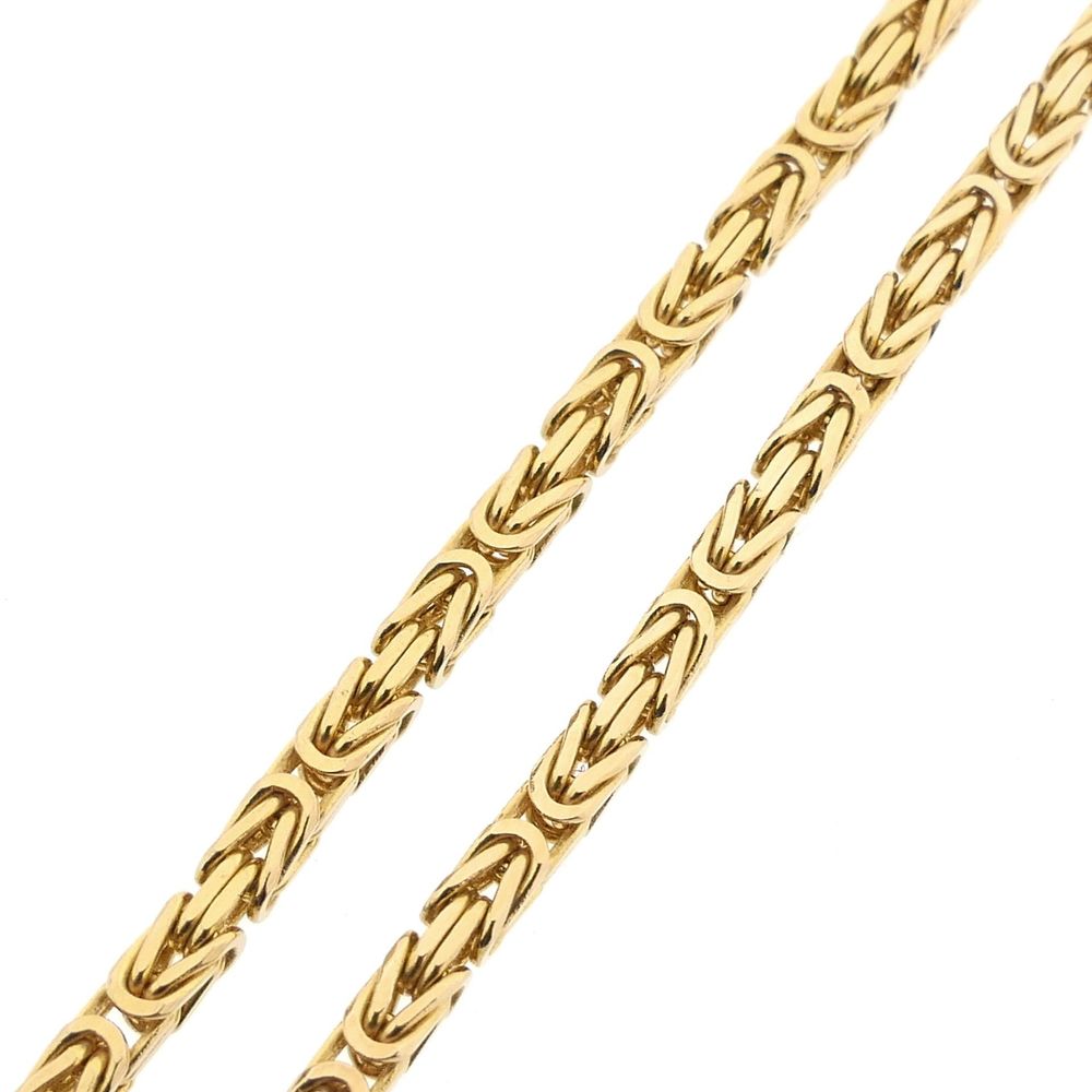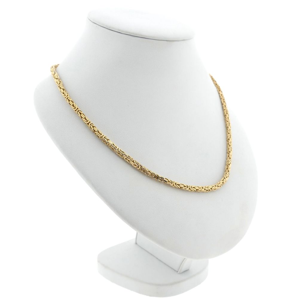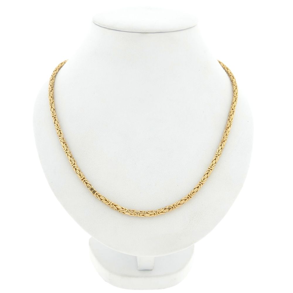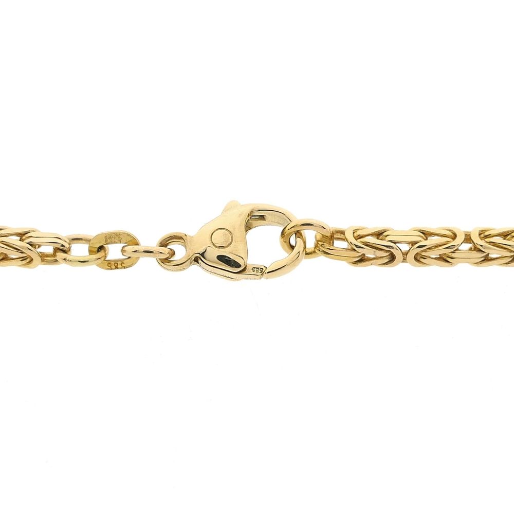 Golden square necklace made with Byzantine links, also known as the royal link. The link work appears complex and luxurious, and the design dates back to the 5th century! This beautiful necklace closes with a lobster clasp and is made of 14 karat yellow gold (585/1000).